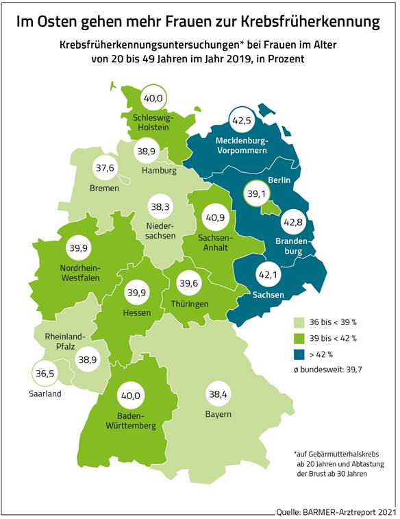 Laut der Analyse gibt es deutliche regionale Unterschiede bei der Inanspruchnahme von Früherkennungsuntersuchungen auf Gebärmutterhals- und Brustkrebs bei Frauen sowie auf Prostatakrebs bei Männern. Im Analysezeitraum wiesen bei Frauen das Saarland (36,5 Prozent) und Niedersachsen (38,3 Prozent) die niedrigsten Untersuchungsraten auf. In den ostdeutschen Flächenländern waren die Raten dagegen merklich höher. So war Brandenburg Spitzenreiter mit 42,8 Prozent. Bei den Männern variierten die Unterschiede zwischen den Bundesländern stärker. Die geringsten Raten gab es im Saarland (9,3 Prozent) und in Bayern (10,3 Prozent).