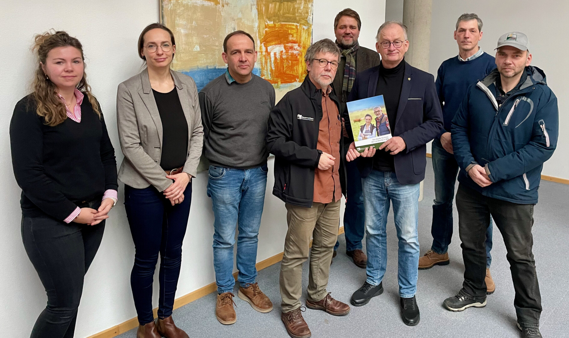 Bild: Vertreter der Bauernverbände bei der Übergabe der Petition in Neubrandenburg: von links: Thea von Hartz (Bauernverband Mecklenburg-Strelitz und Altentreptow), Isabell Kleinhardt (Bauernverband Malchin), Stefan Barkmeyer (Bauernverband Altentreptow), Matthias Schmidt und Jan-Hendrik Rust (Bauernverband Müritz), Landrat Heiko Kärger, Heiko Jahns (Bauernverband Demmin), Claus-Dieter Tobaben (Bauernverband Malchin)