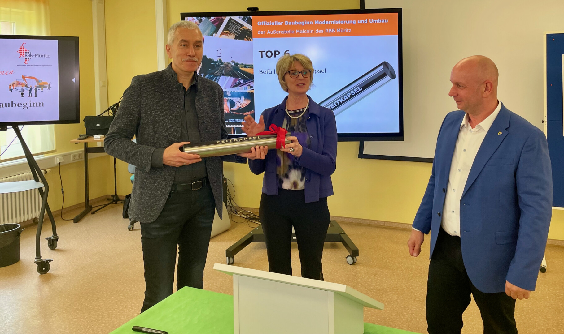 Mit dem Befüllen einer Zeitkapsel, die in frühestens 70 Jahren geöffnet werden soll, hat die Modernisierung der Außenstelle des Regionalen Beruflichen Bildungszentrums (RBB) Müritz in Malchin begonnen. Für rund 6,5 Millionen Euro sollen die teils mehrere Jahrzehnte alten Gebäudeteile grundlegend modernisiert werden, eine Zuwendung in Höhe von 4 Millionen Euro wurde vom Landesförderinstitut M-V in Aussicht gestellt. Hintergrund für die Maßnahme ist auch das erwartete höhere Schüleraufkommen in den kommenden Jahren.