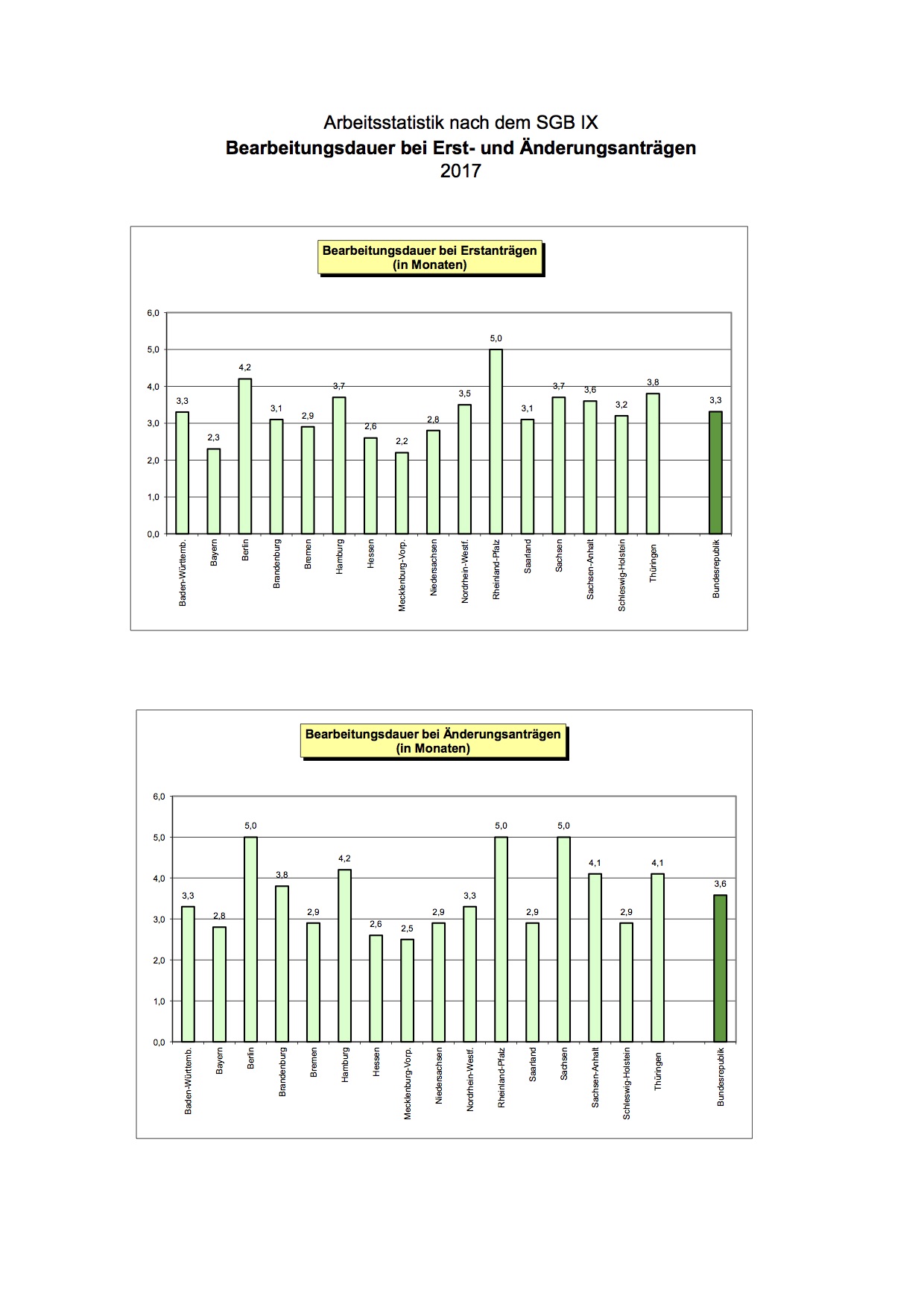 Wer erstmals einen Antrag auf einen Schwerbehindertenausweis stellt, möchte seinen Ausweis auch schnellstmöglich erhalten. Die Bearbeitung solcher Anträge dauerte 2017 deutschlandweit durchschnittlich 3,3 Monate – in Mecklenburg-Vorpommern waren es lediglich 2,2 Monate. Damit hat sich Mecklenburg-Vorpommern im Ländervergleich auf Platz 1 vorgeschoben.