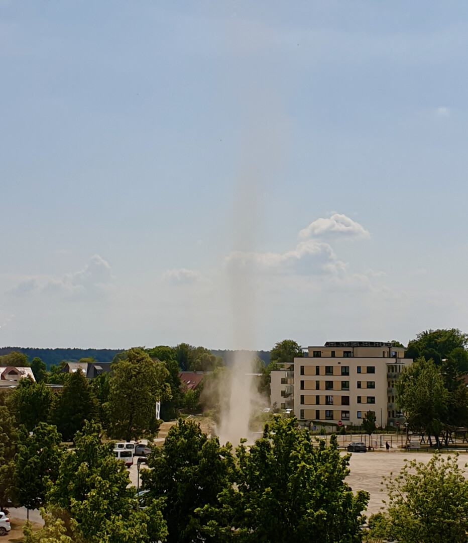 Nanu, was war denn da heute los auf dem Festplatz am Warener Amtsbrink? Was aussieht wie eine Windhose, ist ein so genannter Staubteufel, im Fachjargon Kleintrombe genannt. Die Staubteufel treten insbesondere bei sonnigem Wetter auf. Sie können sich bilden, wenn sich die Luft bei starker Sonneneinstrahlung bodennah besonders stark aufheizt.
