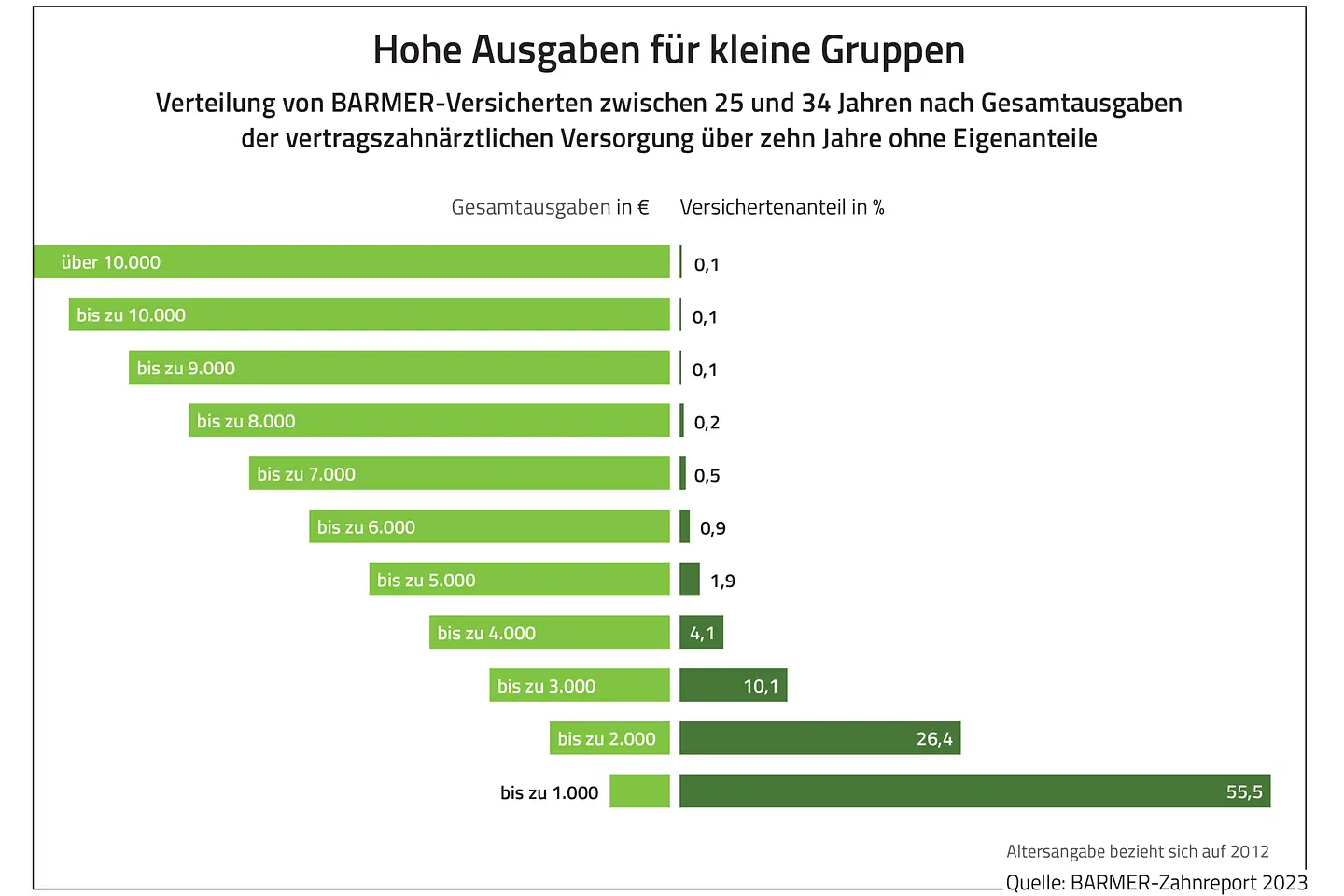 Wie aus dem Zahnreport hervorgeht, haben einige Versichertengruppen etwa bei Zahnersatz und Kronen einen hohen Therapiebedarf und verursachen somit einen erheblichen Teil der Kosten. Dazu zählen zum Beispiel etwa 84.000 Versicherte in der Alterskohorte von 65 bis 74 Jahren, bei denen in zehn Jahren durchschnittlich Ausgaben für die Kasse von etwa 2.500 Euro anfallen. In den zahnmedizinischen Verläufen zeigt sich auch, dass die Ausgaben für Zahnersatz und Kronen mit zunehmendem Alter an Bedeutung gewinnen. So benötigten in der Alterskohorte der 45- bis 54-Jährigen über zehn Jahre mehr als 60 Prozent der Versicherten Zahnersatz. Bei den 65- bis 74-Jährigen wurde bei mehr als 75 Prozent der Versicherten Zahnersatz eingegliedert.