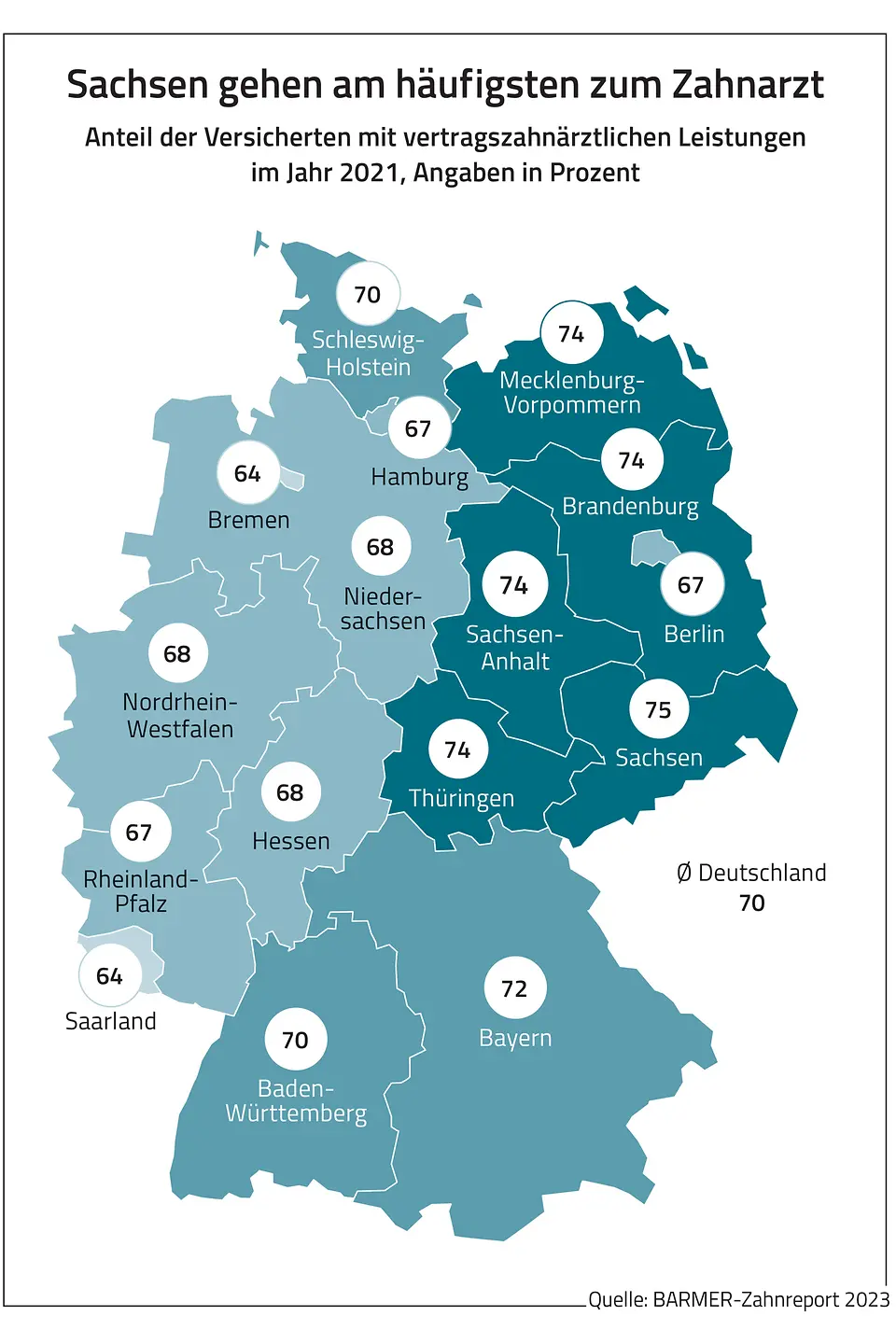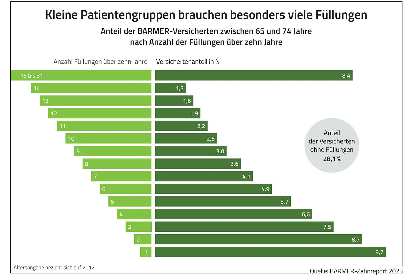 Im Zahnreport haben die Autoren neben soziodemografischen Faktoren auch regionale Unterschiede bei der Betrachtung von Versicherten einbezogen, die eine zahnärztliche Therapie besonders viel oder besonders wenig in Anspruch genommen haben. Dabei zeigt sich, dass in Abhängigkeit von Alter und Region die Mundgesundheit mitunter sehr unterschiedlich ist. So gibt es einen deutlichen Ost-West-Unterschied. Der Anteil der Versicherten, die häufig Füllungen benötigten, liegt in den ostdeutschen Flächenländern um 42 Prozent über dem Bundesschnitt. Beispielsweise liegt dieser Anteil im thüringischen Suhl über alle Altersgruppen ganze 70 Prozent über dem Bundesschnitt. Die festgestellten Unterschiede in der Versorgung in Ost und West deuten darauf hin, dass in den ostdeutschen Bundesländern eine konservierende Zahnmedizin gegenüber einer stärker auf Zahnersatz ausgerichteten Versorgung im Westen überwiegen könnte.