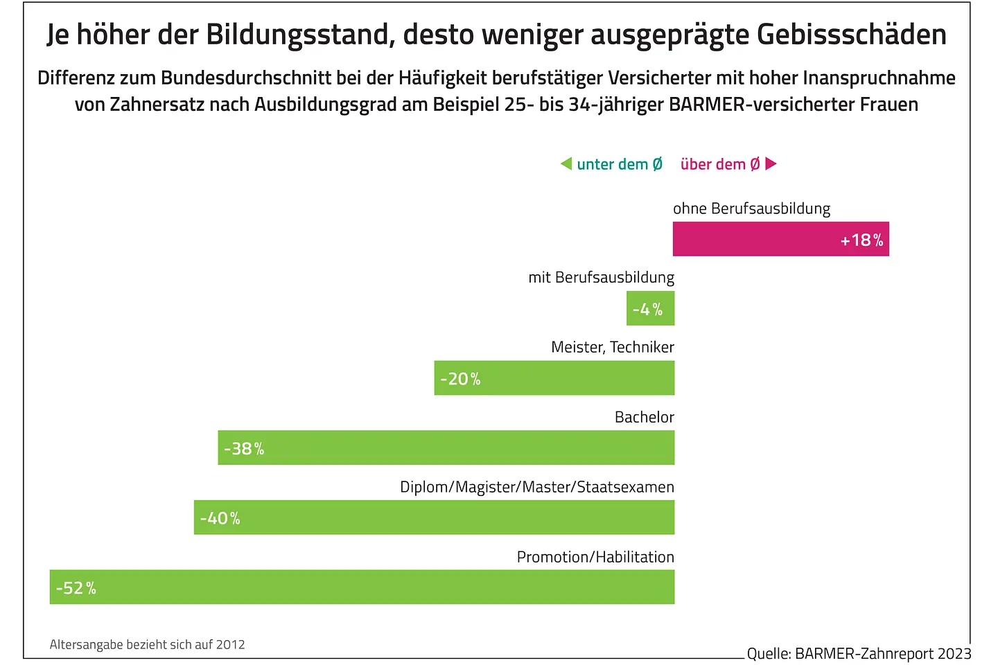 Dem Zahnreport zufolge besteht ein Zusammenhang zwischen Bildungsstand und der besonders häufigen Versorgung mit Zahnersatz. Je höher der Ausbildungsgrad der Betroffenen, desto seltener benötigen sie viel Zahnersatz. So gibt es unter Versicherten mit Diplom oder Magister-Abschluss im Vergleich zum Bevölkerungsdurchschnitt rund 35 Prozent weniger Personen mit hoher Inanspruchnahme von Zahnersatz. Das weist auf deutlich weniger ausgeprägte Gebissschäden hin. „Der Zahnreport belegt eindrücklich, dass solche Faktoren bei der Analyse und Planung prophylaktischer und therapeutischer Leistungen berücksichtigt werden sollten“, sagte Barmer-Chef Straub.