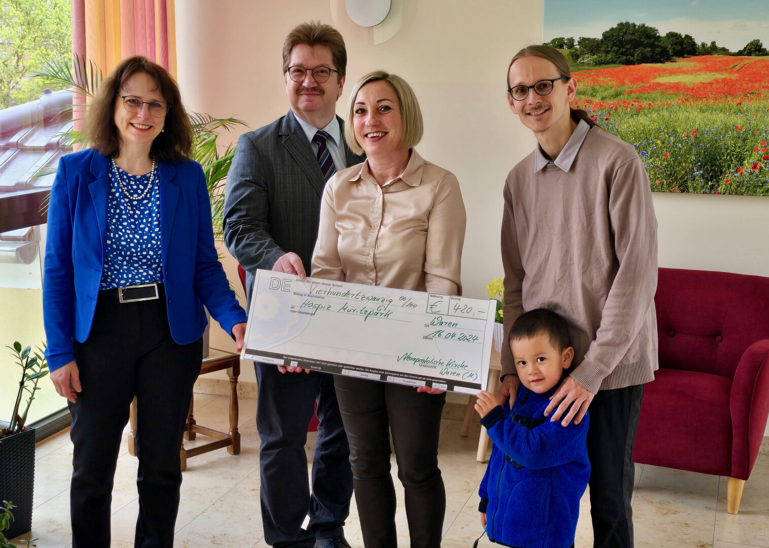 Foto: Bei der Übergabe des Schecks: Anja Lamster, Steffen Ackermann von der Neuapostolischen Kirche sowie Friedemann Schneeweiß mit seinem Sohn Jonathan.