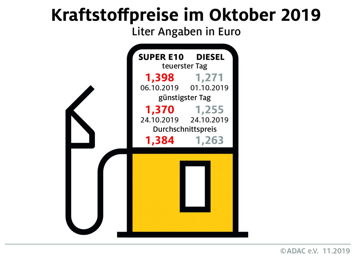 Am preiswertesten konnte man im vergangenen Monat beide Sorten am 24. Oktober tanken. An diesem Tag mussten Autofahrer für einen Liter Super E10 durchschnittlich 1,370 Euro und für einen Liter Diesel 1,255 Euro bezahlen. Am teuersten war Super E10 im bundesweiten Mittel mit 1,398 Euro je Liter am 6. Oktober, bei Diesel wurde der Monatshöchststand mit 1,271 Euro je Liter am 1. Oktober erreicht.