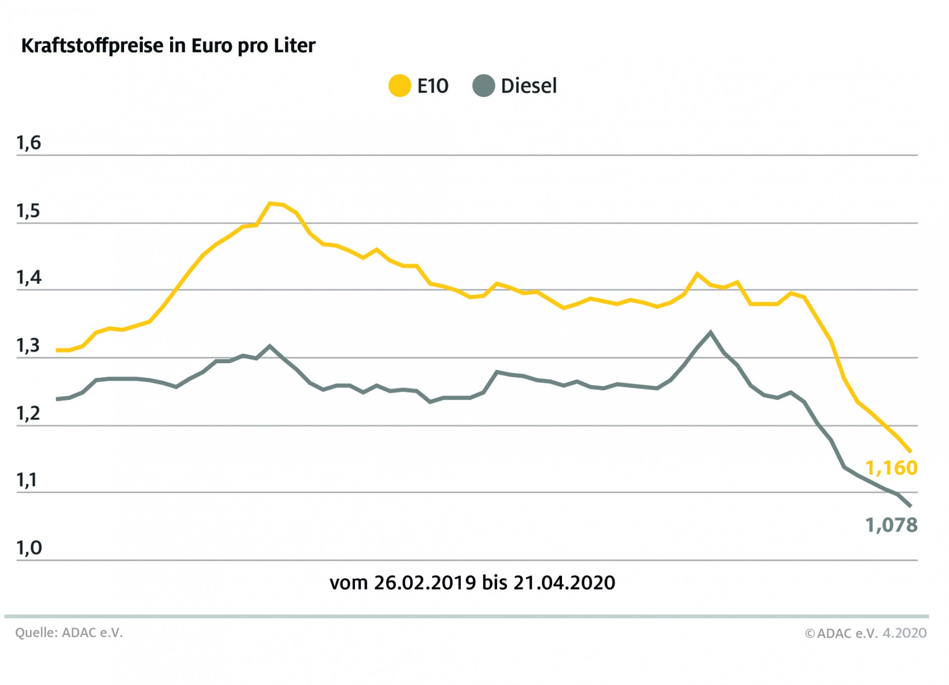 Der Kraftstoffmarkt steht weiter ganz im Zeichen der Corona-Krise. Tanken ist im bundesweiten Durchschnitt bereits die neunte Woche in Folge billiger geworden. Laut aktueller Auswertung des ADAC müssen Autofahrer für einen Liter Super E10 im Bundesmittel 1,160 Euro bezahlen, das sind 2,1 Cent weniger als in der Vorwoche. Benzin ist damit so günstig wie zuletzt 2009.