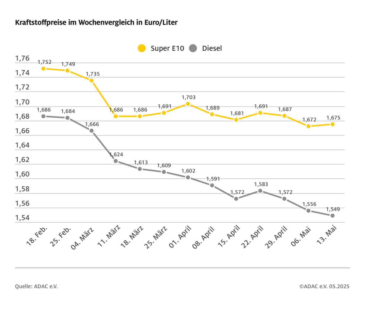 Begleitet wird die gegensätzliche Entwicklung der Kraftstoffpreise von einem gestiegenen Rohölpreis, der sich wieder deutlich von der Marke um 60 US-Dollar je Barrel der Sorte Brent entfernt hat. So kostet ein Fass mit ca. 159 Litern derzeit fast 67 US-Dollar nach rund 62 US-Dollar in der Vorwoche. Die Ölpreise ziehen vor allem wegen der vorübergehenden Zollpause zwischen den USA und China und der damit einhergehenden Markterholung wieder an.