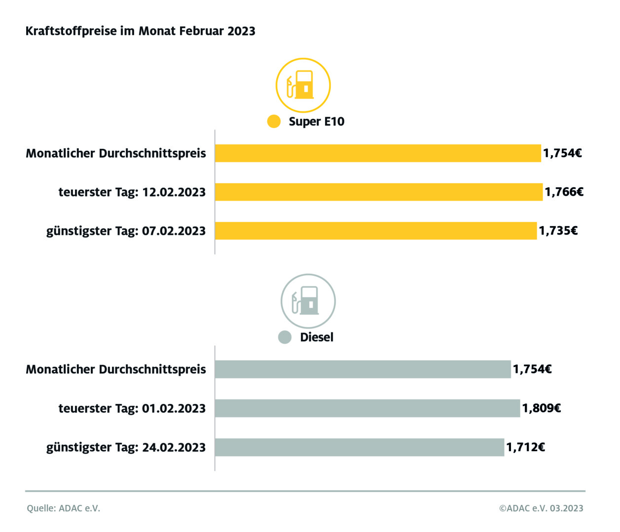 Die Unterschiede der Tagesdurchschnittspreise innerhalb des vergangenen Monats waren bei Benzin eher gering. Teuerster Tag zum Tanken war der 12. Februar mit 1,766 Euro je Liter Super E10, günstigster war der 7. Februar mit 1,735 Euro. Dass sich die Preise der beiden Kraftstoffsorten im Monatsmittel angeglichen haben, lag aber vor allem am deutlicheren Rückgang des Dieselpreises: Den höchsten Stand registrierte der ADAC am 1. Februar mit 1,809 Euro, den niedrigsten am 24. Februar mit 1,712 Euro. Bis einschließlich 13. Februar war Diesel teurer als Super E10, ab dem 14. Februar kehrte sich diese Relation nach über acht Monaten wieder um.