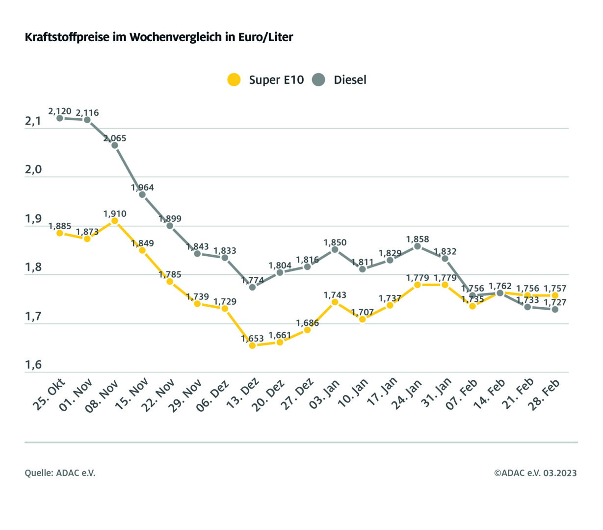 Die Unterschiede der Tagesdurchschnittspreise innerhalb des vergangenen Monats waren bei Benzin eher gering. Teuerster Tag zum Tanken war der 12. Februar mit 1,766 Euro je Liter Super E10, günstigster war der 7. Februar mit 1,735 Euro. Dass sich die Preise der beiden Kraftstoffsorten im Monatsmittel angeglichen haben, lag aber vor allem am deutlicheren Rückgang des Dieselpreises: Den höchsten Stand registrierte der ADAC am 1. Februar mit 1,809 Euro, den niedrigsten am 24. Februar mit 1,712 Euro. Bis einschließlich 13. Februar war Diesel teurer als Super E10, ab dem 14. Februar kehrte sich diese Relation nach über acht Monaten wieder um.