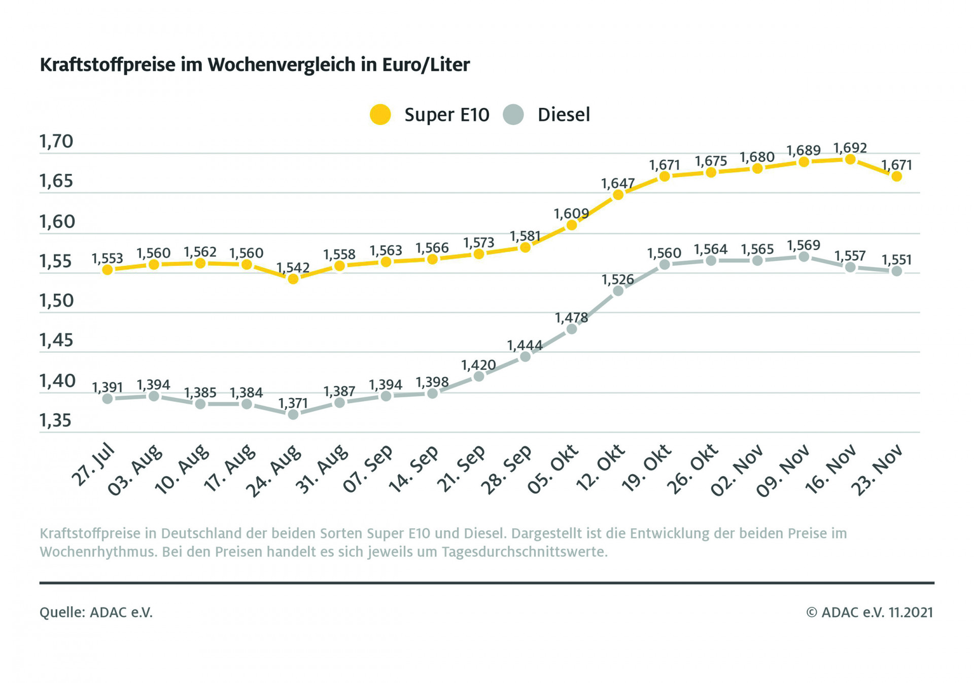 Trotz des aktuellen Preisrückgangs an den Zapfsäulen sieht der ADAC nach wie vor Spielraum für einen weiteren Preisrückgang. Hintergrund der Preisentwicklung ist die leichte Entspannung am Ölmarkt, allerdings gedämpft durch die Schwäche des Euro gegenüber dem US-Dollar. Für weitere Unruhe auf dem Ölmarkt sorgt das geplante Anzapfen der strategischen Ölreserve durch die USA und weitere Länder.