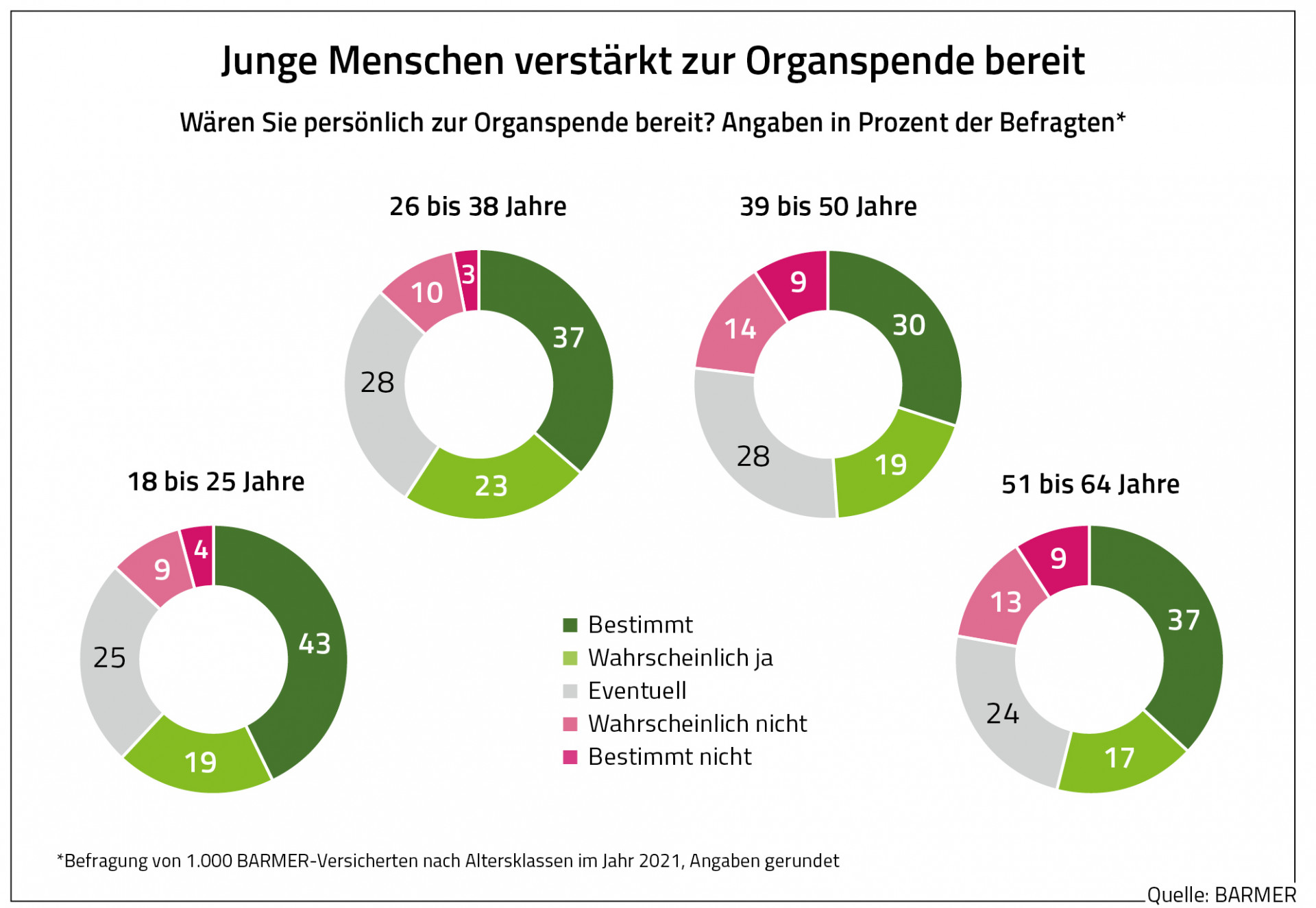 Eine repräsentative Umfrage unter 1.000 BARMER-Versicherten hatte jüngst ergeben, dass die Bereitschaft zur Organspende gestiegen ist. Demnach erklärten 36 Prozent der Befragten, dass sie bestimmt zur Organspende bereit sind und weitere 19 Prozent, dass sie wahrscheinlich ja dazu sagen würden. Im Jahr 2020 waren lediglich 32 Prozent der Befragten sicher bereit für eine Organspende, im Jahr 2019 waren es gar nur 23 Prozent. Die Zahl derer, die eine Organspende sicher ausschließen, ist dagegen in diesem Jahr von neun auf sechs Prozent gesunken.