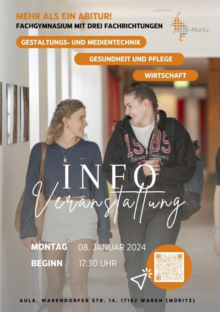 Am Regionalen Beruflichen Bildungszentrums Müritz (RBB) wird am kommenden Montag, 8. Januar, ab 17.30 Uhr über das Schulangebot im Bereich des Fachgymnasiums informiert. Die Veranstaltung richtet sich an alle Eltern und deren Kinder, die nach dem Abschluss der Klasse 10 in den Regionalschulen oder dem Abschluss der Klasse 9 oder 10 an einem Gymnasium den Weg zum Abitur einschlagen bzw. fortsetzen wollen.