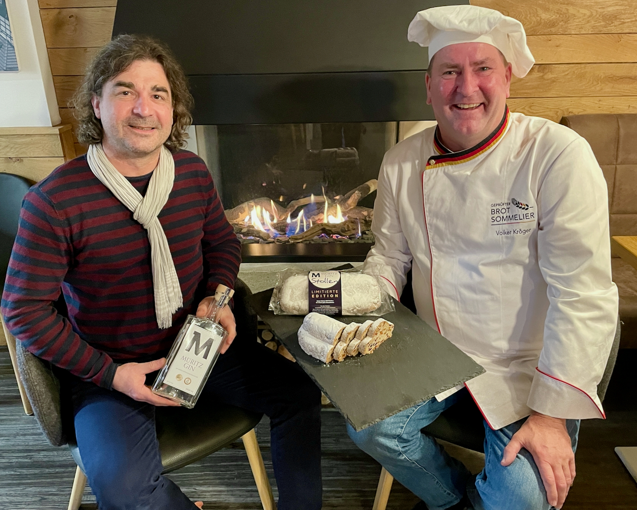 Foto oben: Thomas Engels und Volker Kröger präsentieren den „Müritz Gin Stollen“.