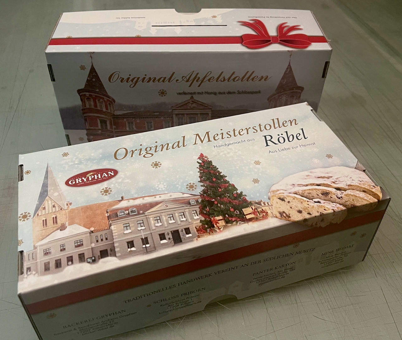Fast acht Wochen sind sie gereift – zwei besondere Adventstollen aus Röbel. Sie lagerten so lange in dem ehemaligen Weinkeller des Schlosses Priborn. Gebacken hat den Röbeler Meisterstollen und den Priborner Apfelstollen Bäckermeister Gryphan aus Röbel. Die exklusive und hochwertige Geschenkverpackung beider Stollen stellte die Röbeler Firma Panterkarton her. Zudem kamen die Zutaten für den Apfelstollen aus Priborn direkt vom Schloss-Gut, gebacken wurde mit den Äpfeln der Streuobstwiese und dem Honig aus dem Schlosspark.