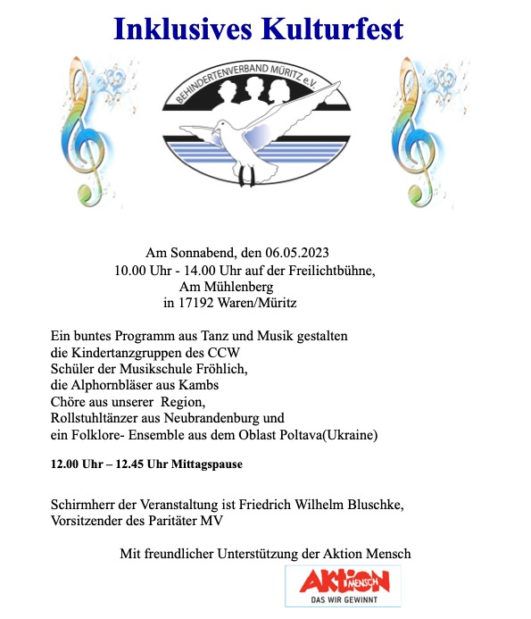 Der Behindertenverband Müritz lädt am morgigen Sonnabend, 6. Mai, wieder zu einem „Inklusiven Kulturfest“ auf die Warener Freilichtbühne ein. Die Besucher können sich auf ein buntes Programm unter anderem mit der Kindertanzgruppe des CCW, Rollstuhltänzern, dem Röbeler Männerchor und dem Penzliner Frauenchor freuen.