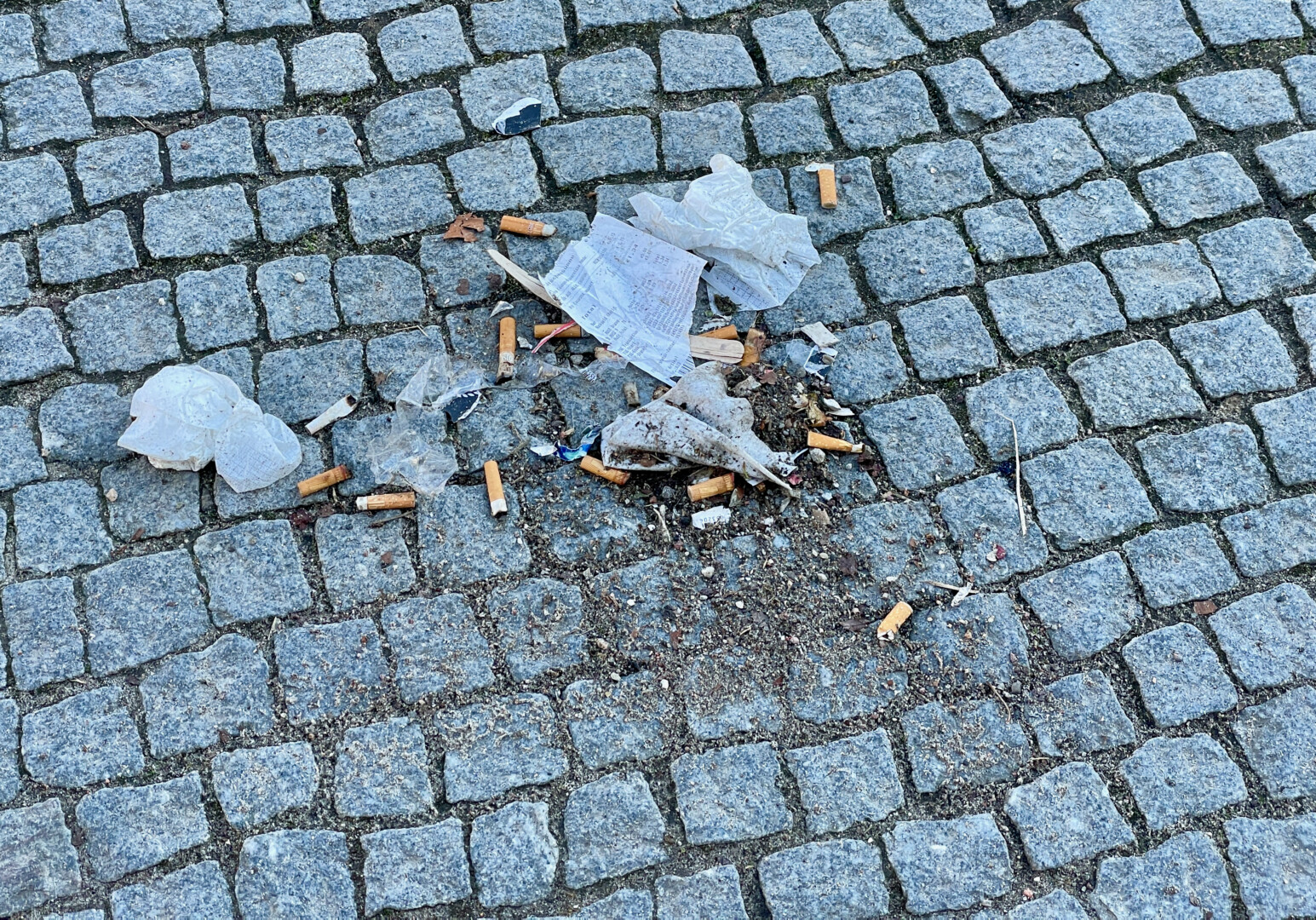 Wie hier am Neuen Markt. Da hat zwar jemand Kippen und Papier zu mehreren Häufchen zusammengefegt, doch die blieben dann liegen.