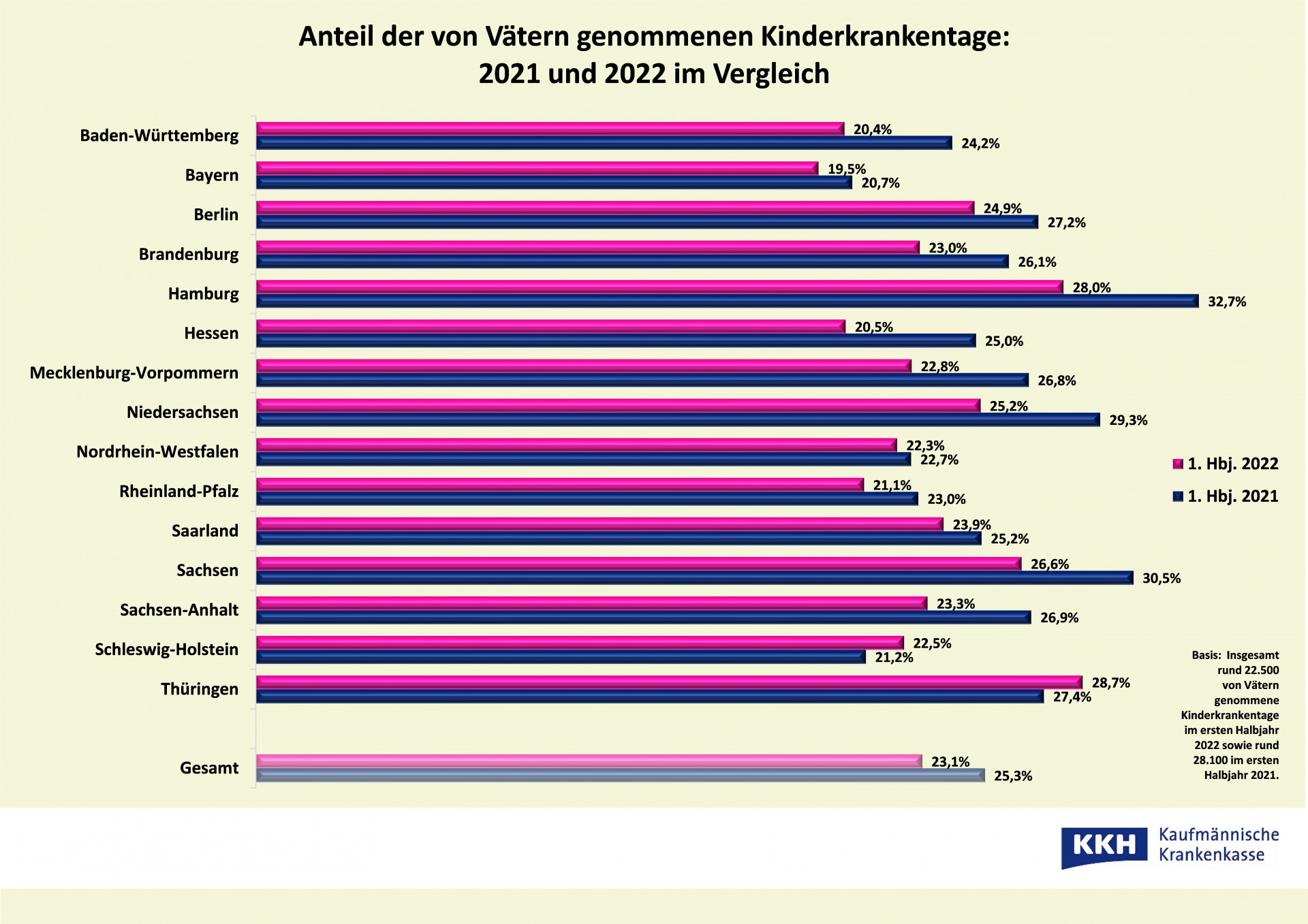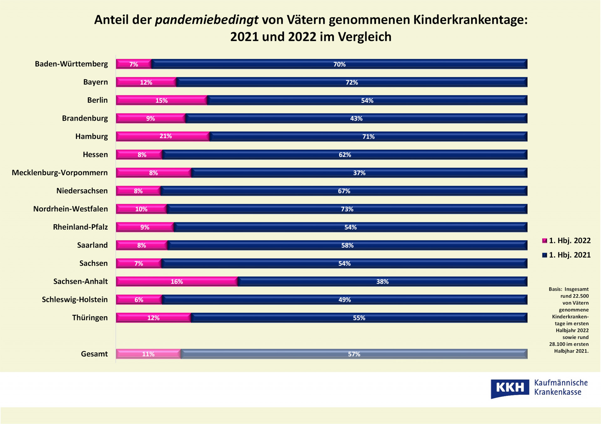 Ein möglicher Grund für diese Entwicklung sind die Corona-Lockerungen in diesem Jahr. Diese brachten wieder mehr Normalität in den Kita-, Schul- und Arbeitsalltag. So hatte im ersten Halbjahr 2022 auch nur jeder 13. betroffene KKH-versicherte Vater im Nordosten pandemiebedingte Kinderkrankentage in Anspruch genommen. Im Vorjahreszeitraum war es hingegen noch mehr als ein Drittel der Väter. Eine entsprechende Regelung wurde bis ins kommende Jahr 2023 hinein verlängert. Demnach können Eltern auch Kinderkrankentage beantragen, wenn der Nachwuchs nicht krank ist, aber dennoch zu Hause betreut werden muss. Dies war bislang etwa bei coronabedingten Kita- und Schulschließungen der Fall.