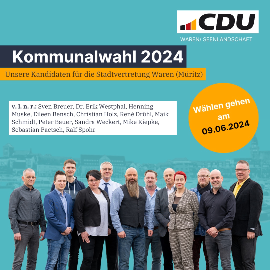 Gehen Sie am 09.06.2024 zur Wahl. Geben Sie der CDU Ihre Stimmen für ein starkes und handlungsfähiges Waren (Müritz).