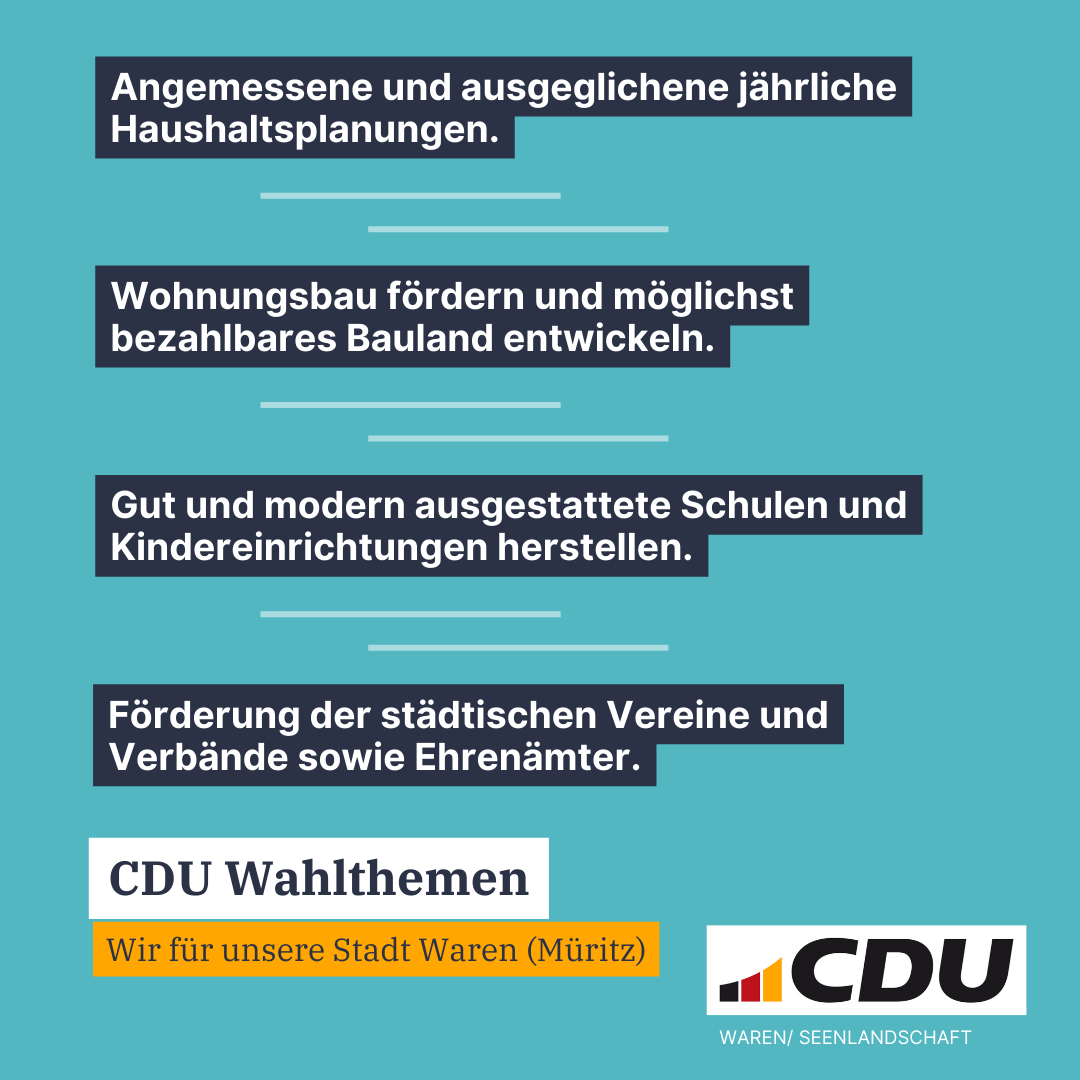 Die Warener CDU ist in der aktuellen Stadtvertretung mit sechs Mitgliedern vertreten und möchte auch zukünftig als Fraktion ihre Heimatstadt aktiv mitgestalten. Dies geht nur auf Grundlage einer stabilen und ausgeglichenen jährlichen Haushaltsplanung, welche die Stadt weiter voranbringt und dabei spürbare Belastungen für die Bürgerinnen und Bürger vermeidet. So war es vor allem die Warener CDU, die sich entschieden gegen die Erhöhung von Steuern wie z. B. der Gewerbesteuer gestellt hat.