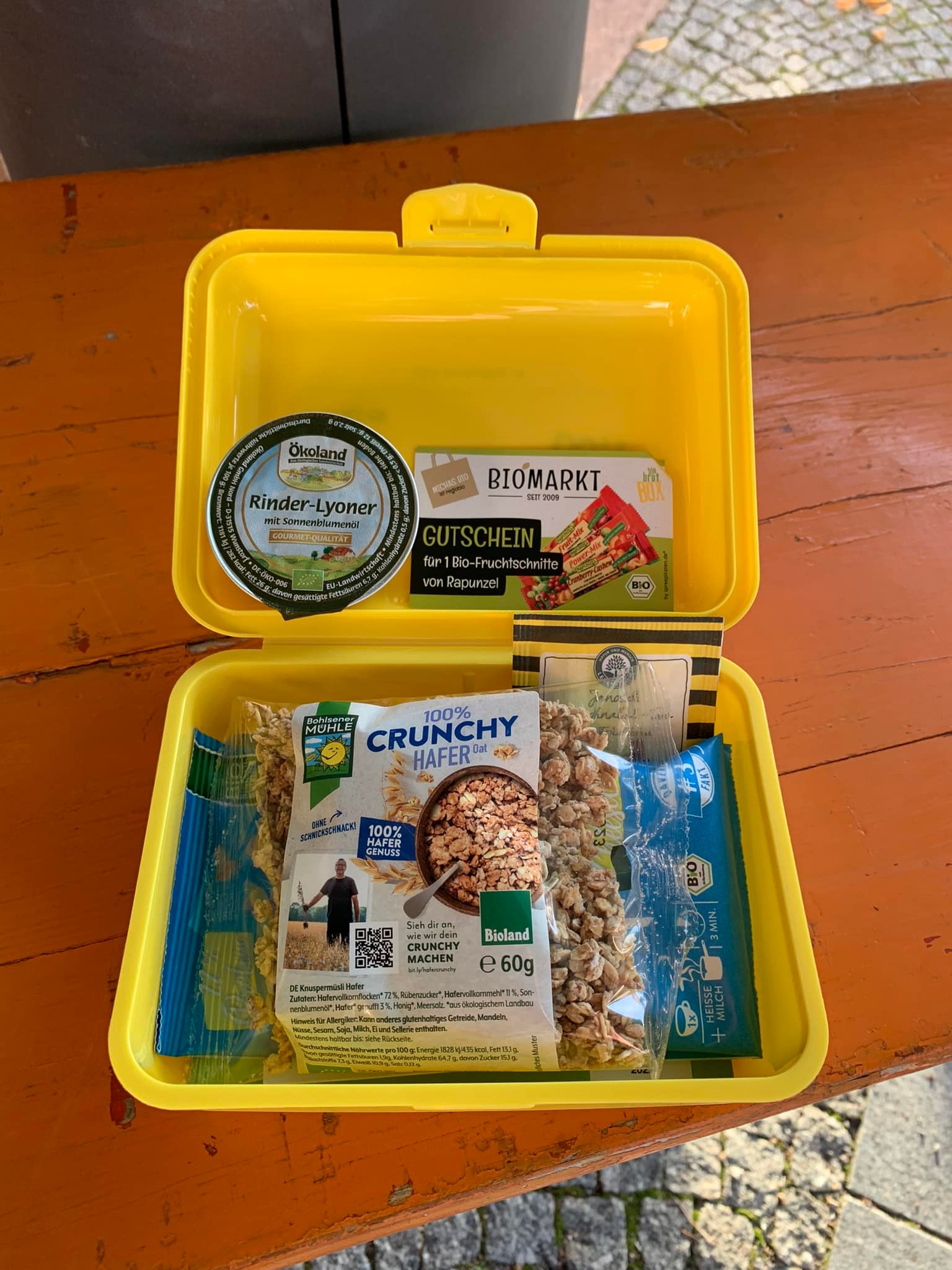 Um Ressourcen zu schonen, findet sich in den Boxen Produkte auch ein Müslirigel, deren Mindesthaltbarkeitsdatum nach Qualitätsprüfung noch einmal verlängert wurde. So werden wertvolle Produkte nicht vernichtet, sondern weiterhin als Nahrungsmittel genutzt.