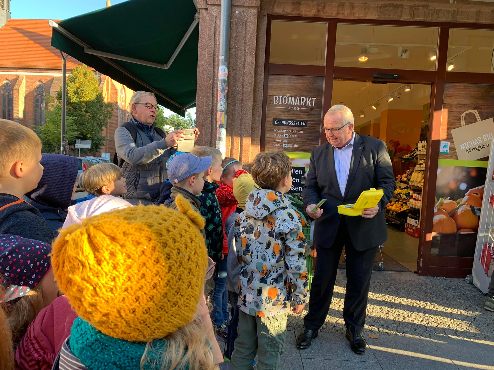 Vor dem Neubrandenburger Biomarkt hatLandwirtschaftsminister Backhaus heute die an den Schulen beliebten Bio-Brotboxen stellvertretend an eine Schulklasse mit 21 Erstklässler der Evangelischen Schule St. Marien. Insgesamt 6.200 Schüler an 110 Schulen erhalten in diesem Jahr eine Bio-Brotbox, die von lokalen Bio-Unternehmen für die Kinder gepackt wird.