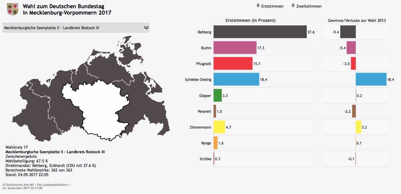 So sieht’s bei den Erststimmen nach 362 von 363 ausgezählten Wahlbezirken in unserem Wahlbezirk aus: Das Direktmandat geht wie bereits berichtet an Eckhardt Rehberg.