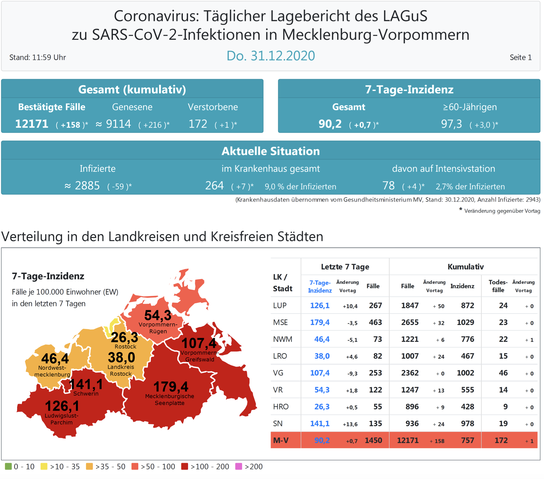 Das Landesamt für Gesundheit registriert für Mecklenburg-Vorpommern 158 neue Fälle. Der Landkreis Mecklenburgische Seenplatte meldet 32 Neuinfektionen. Der Inzidenzwert liegt in unserem Landkreis heute bei 179,4 und damit weiter am höchsten in Mecklenburg-Vorpommern. Allerdings handelt es sich heute nur um Zahlen eine halben Tages.