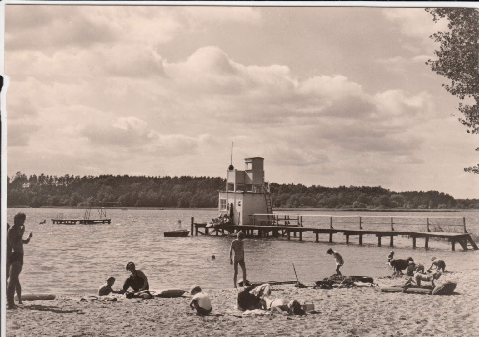 Badestelle Seebad Waren (Müritz), in den 70-igern habe ich dort Rettungsdienst gemacht, später wurde das Rettungshaus an Land gesetzt, und der Sprungturm abgerissen, weil die Wassertiefe seitlich zu gering war und es zu Unfällen gekommen ist, das hinter dem Rettungshaus zu sehnende Schilfrohr reichte damals bis zum Rettungshaus, ich vermute es wurde entfernt um die Badestelle zu erweitern, man sieht auf der Eldenburgseite den großen Schilfgürtel der leider heute auch völlig verschwunden ist.