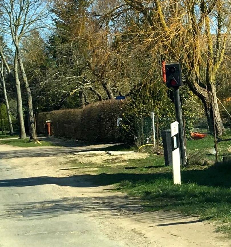 Die Straße lädt zwar ob ihres Zustandes nicht unbedingt zum Rasen ein, aber wer weiß. Jedenfalls steht an der Straße jetzt ein Blitzer. Nein, kein echter. Aber ein ziemlich gut gemachter Nachbau.