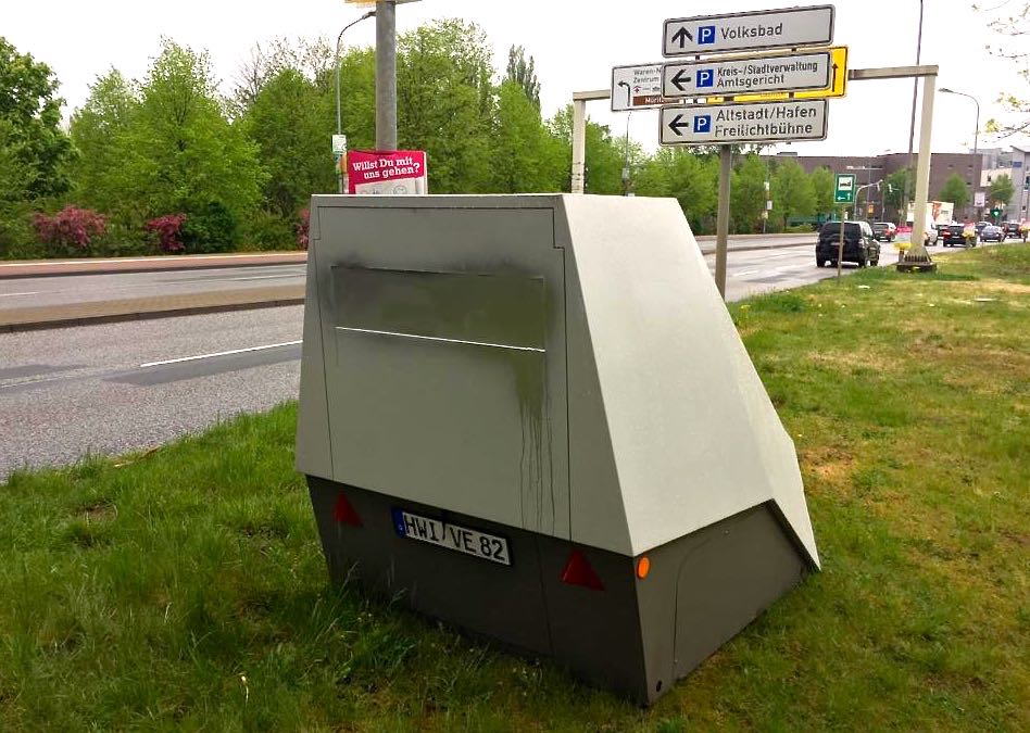 Öfter mal was Neues: Wurde der Blitzeranhänger an seinem Standort unter der Warener Herrenseebrücke in der Vergangenheit bereits zweimal mit roter Farbe außer Gefecht gesetzt, ist er in der letzten Nacht mit silberner Farbe versehen worden…