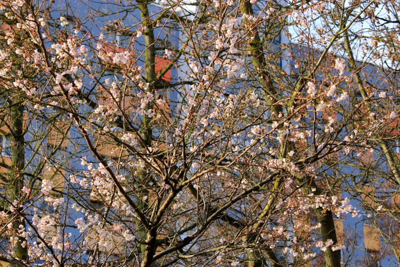 Blühende Kirschbäume auch an den Hochhäusern in Waren.