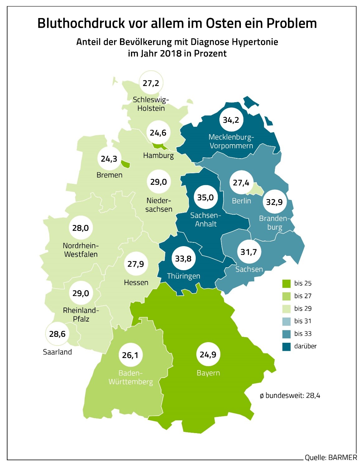 Laut einer BARMER-Analyse gab es im Jahr 2018 deutliche regionale Unterschiede bei Hypertonie-Diagnosen. Demnach war die Betroffenenrate mit 35,0 Prozent in Sachsen-Anhalt am höchsten und in Bremen mit 24,3 Prozent am niedrigsten. Insgesamt wurde Bluthochdruck in den neuen Ländern häufiger diagnostiziert und zwar bei 34,2 Prozent der Einwohner in Mecklenburg-Vorpommern, 33,8 Prozent in Thüringen, 32,9 Prozent in Brandenburg und 31,7 Prozent in Sachsen.