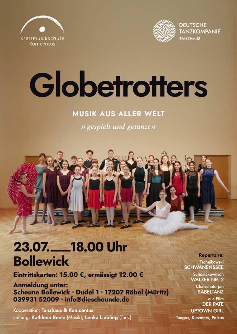 „Globetrotters“ heißt ein gemeinsames Projekt der Kreismusikschule Kon.centus Neubrandenburg und des Tanzhauses der Tanzkompanie Neustrelitz. Mit der „Musikalischen Reise um die Welt“ begeisterten die jungen Leute vor wenigen Tagen bereits ein großes Publikum in Neustrelitz und Mirow. Heute Abend bringen die 13 Musikerinnen und Musiker sowie die 25 Tänzerinnen ihr Projekt das letzte Mal auf die Bühne. Und zwar ab 18 Uhr in der Scheune Bollewick.