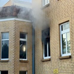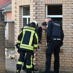 Brandstiftung kann derzeit nicht ausgeschlossen werden, zumal ein Eisenpoller, der vor einem zerborstenen Fenster im Erdgeschoss auf der Rückseite zur Mauerstraße lag, die Aufmerksamkeit der Polizisten auf sich zog.