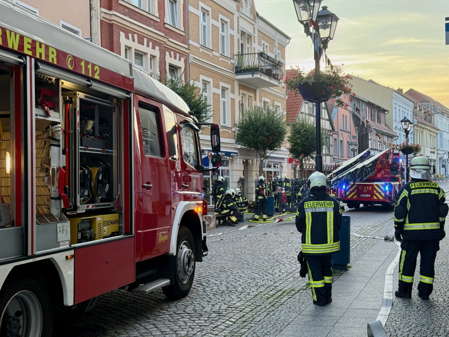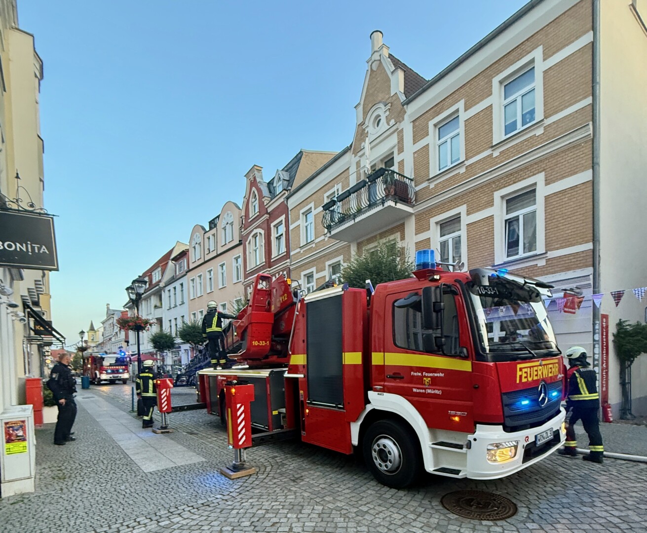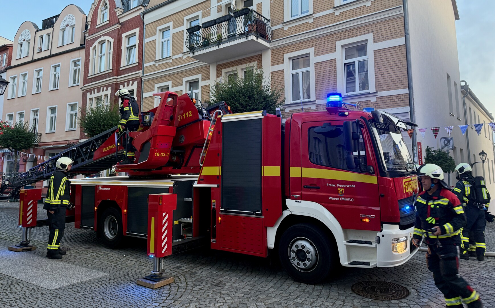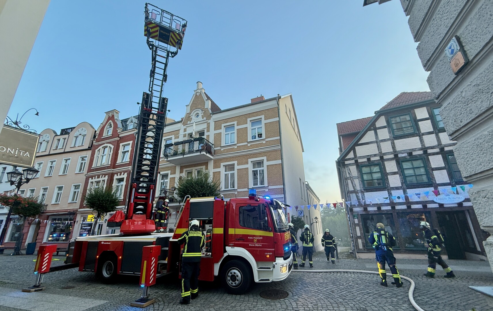 Riesen-Schreck heute früh kurz vor 5 Uhr in Waren: Aus einem Wohn- und Geschäftshaus in der Langen Straße drang dichter Rauch. Innerhalb weniger Minuten waren die ersten Kameraden der Warener Wehr vor Ort, Chef Reimond Kamrath ließ sicherheitshalber auch die Plastener Freiwilligen alarmieren, die Sirene ertönte. Brände in der dicht bebauten Innenstadt können bekanntlich verheerend werden.