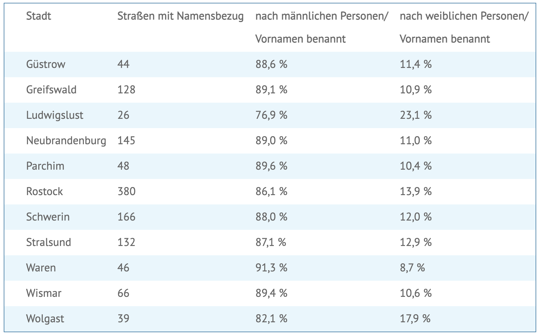 In Mecklenburg-Vorpommern sind insgesamt 26.334 Straßen erfasst. Davon sind 2.232 Straßen nach Personen und 525 Straßen nach Vornamen benannt (10,5 %). Bei den Straßen, die nach Personen benannt sind, gehen 93,1 % auf männliche (z. B. August-Bebel-Straße oder Bismarckstraße) und 6,9 % auf weibliche (z. B. Marie-Curie-Straße) Personen zurück.