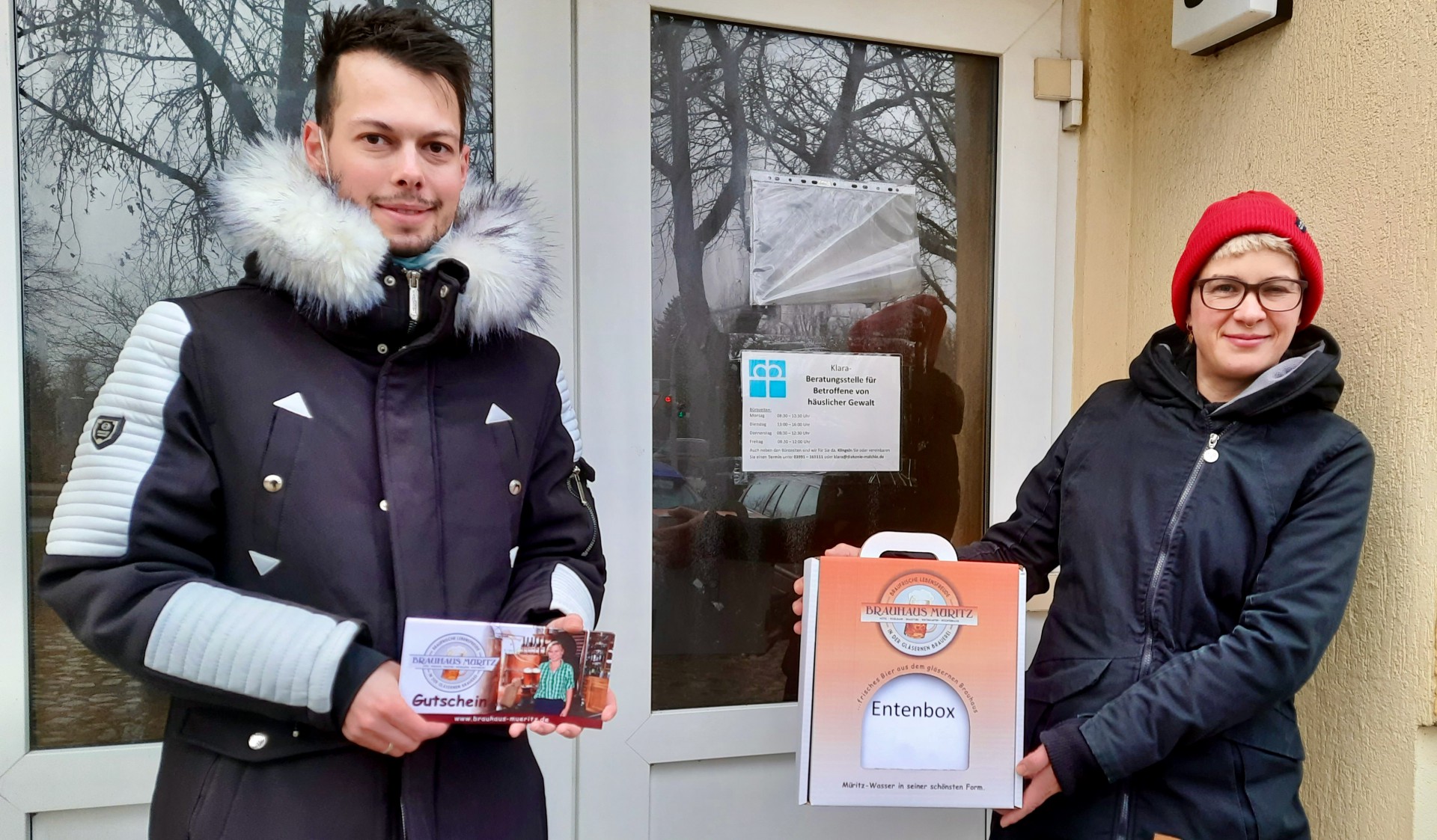 Foto: Brauhaus-Mitarbeiter Phillipp Rößler bei der Übergabe der Entenbox-Gutscheine an Claudia Schwemer. Sie leitet die „Klara“-Beratungsstelle in Waren.