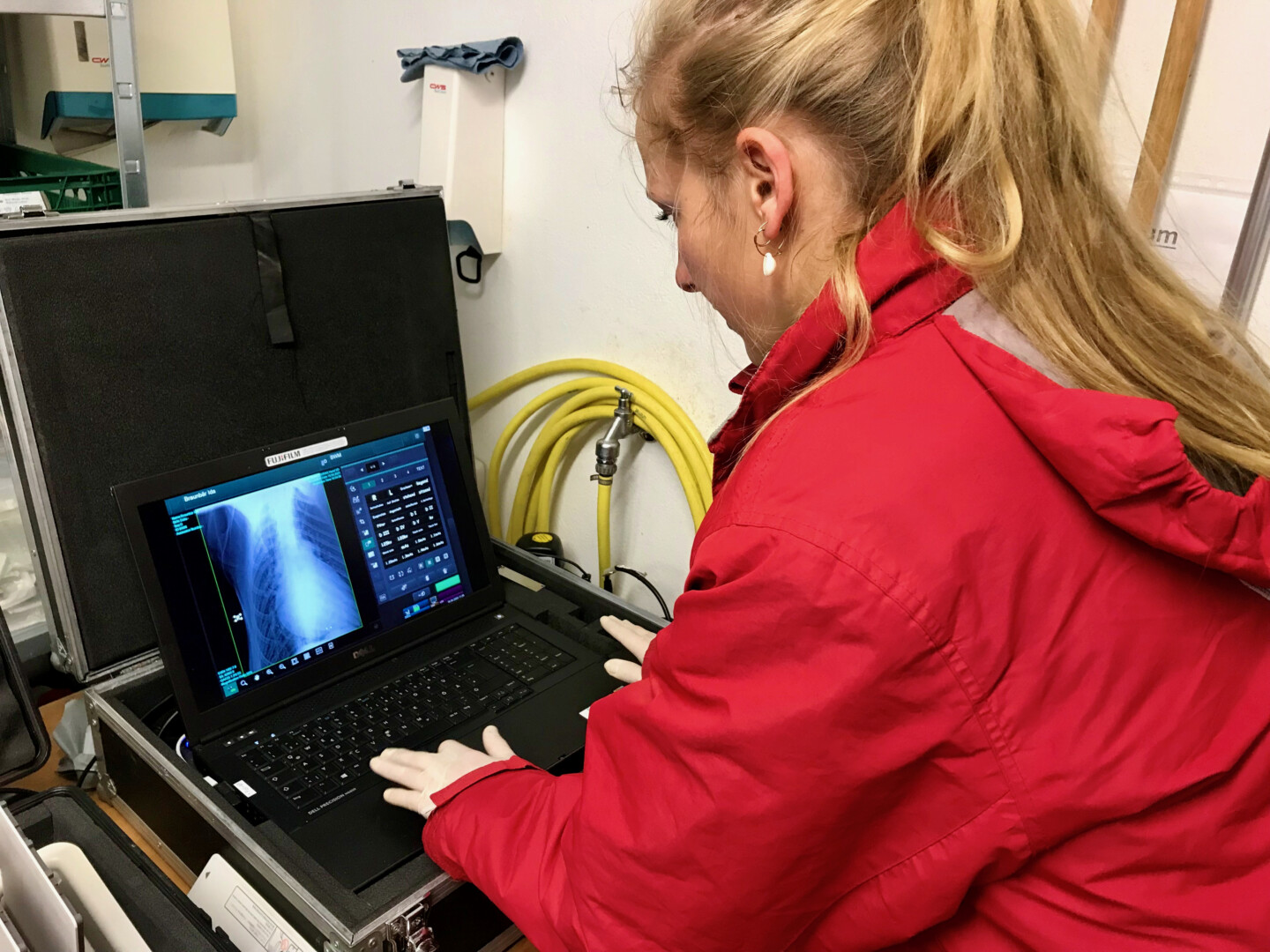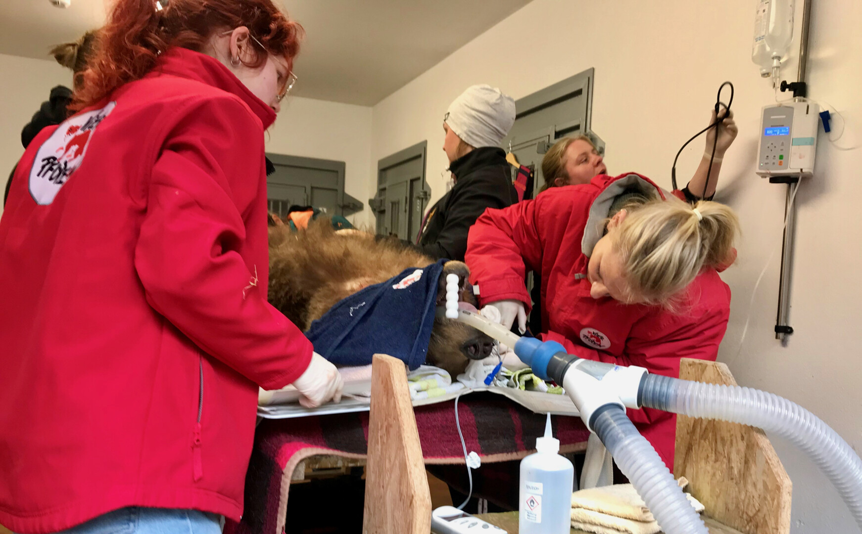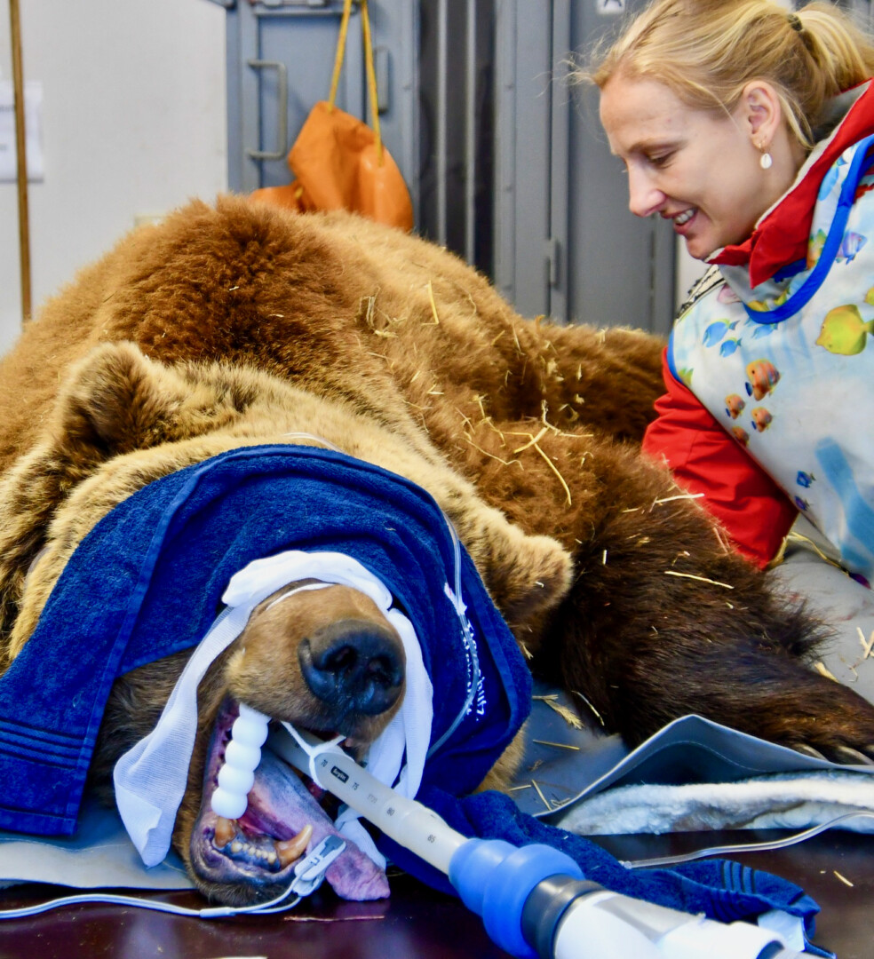 Zur Untersuchung gehörte auch das Fiebermessen. „Das ist wie bei Kindern, das Thermometer landet dafür im Po“, beschreibt Petra Konermann. Und: „Die meisten unserer Bären haben aufgrund ihrer vormals schlechten Haltungen gesundheitliche Probleme, zum Beispiel an den Zähnen oder den Gelenken. Die mobile Tierklinik des Ärzte-Teams erlaubt es, jedes Tier umfangreich zu untersuchen. Hierzu werden Blutproben genommen, die Organe per Ultraschall angesehen sowie Herz und Kreislauf untersucht. Jeder tierische Patient wird vermessen, gewogen und geröntgt. Bei Auffälligkeiten wird möglichst schnell reagiert, um die Zeit zu nutzen, in der das Tier in Narkose ist.“