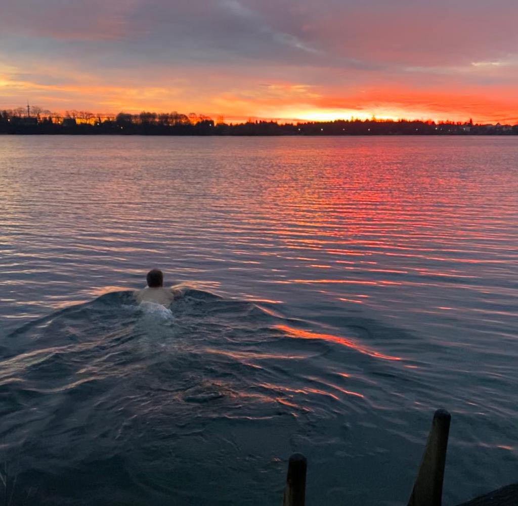 Dem Sonnenaufgang entgegen kann man auch im Dezember schwimmen, wie dieser junge Mann heute früh im Tiefwarensee gezeigt hat…