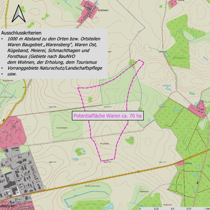 Laut Darstellung des Investors müssen die Windräder einen Abstand von mindestens 1000 Metern zu Waren, insbesondere auch dem Wohngebiet Warensberg, zu Rügeband und Schmachthagen haben.