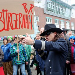 Auch wenn die meisten Demonstranten in bunten Kostümen protestierten, war ihre Aktion nicht weniger ernst gemeint als die bisherigen. Bereits zum dritten Mal machten Betroffene heute ihrem Unmut über die Umzugspläne des Sozialamtes Luft. Dieses Mal am Amtsbrink und mit prominenter Unterstützung, denn Warens Bürgermeister Norbert Möller mischte sich unter die Demonstranten.