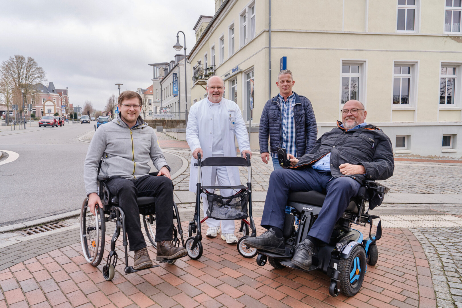 Bei der Gestaltung von Fußwegen und Straßen wird heute zu Recht Barrierefreiheit gefordert. Die große Bedeutung der Barrierefreiheit für Menschen, die auf Rollatoren oder Rollstühle angewiesen sind, konnte Malchows Bürgermeisterkandidat Michael Meyer (CDU) am eigenen Leib testen und erfahren. Auf Einladung der Reha-Klink Malchow begaben sich dessen Geschaftsführer Kay-Uwe Kunze, der einstige MV-Gesundheitsminister und Landtagsabgeordneter Harry Glawe und Bürgermeisterkandidat Michael Meyer auf eine Straßenbegehung der anderen Art. Unterstützung erhielten sie von Enrico May (Medicare) und Chefarzt Dr. med. Jürgen Bauer.