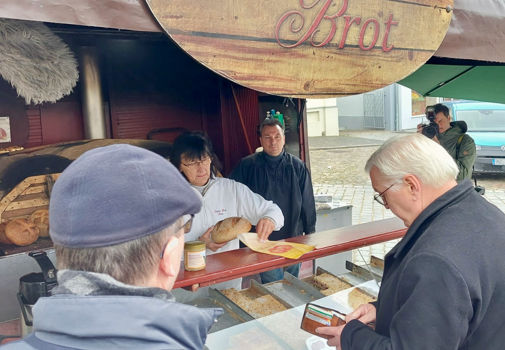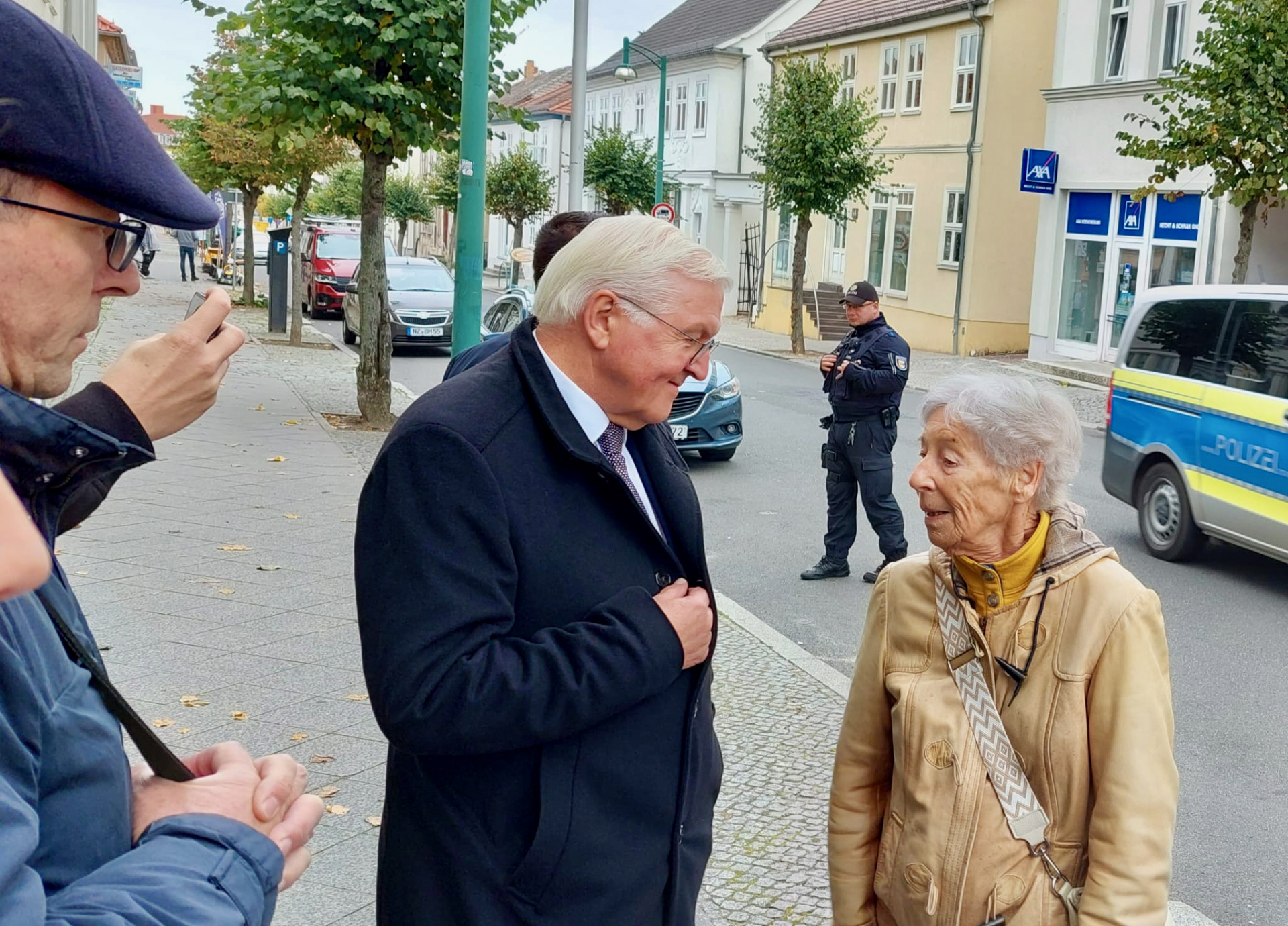 In Neustrelitz wurde Steinmeier überall auf die derzeitigen Probleme der Menschen angesprochen. Beim Steinofenbäcker auf dem Markt, wo er ein Brot kaufte, ging es um die Gas- und die Treibstoffpreise. Die 81-jährige Elke Strahl beklagte, dass es zwar viel Kultur in der Region gibt, aber keine Bekleidungsläden für reifere Leute. Trotzdem freute sich die ehemalige Tierärztin aus Watzkendorf, dass sie Steinmeier zufällig traf.