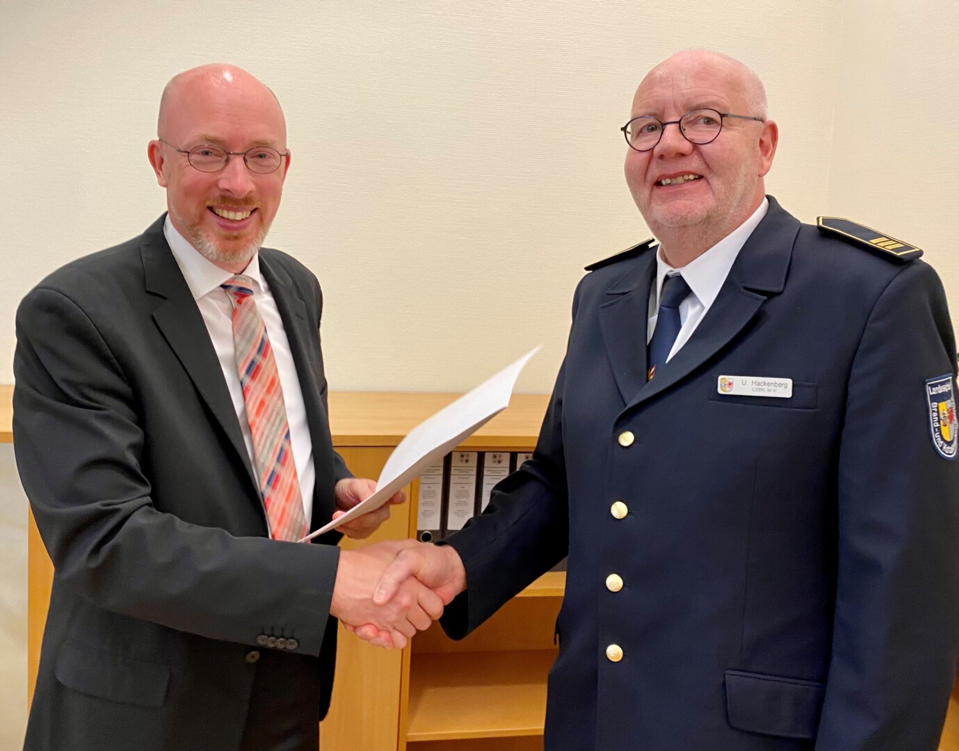 Heute hat Innenminister Christian Pegel den Leiter der Landesschule für Brand- und Katastrophenschutz mit Sitz in Malchow, Ulrich Hackenberg, in den Ruhestand verabschiedet. Nachfolger wird sein bisheriger Stellvertreter Johannes Schuldt. „Vier Jahre lang hat Branddirektor Hackenberg die Geschicke unserer zentralen Ausbildungsstätte für die öffentlichen Feuerwehren des Landes geleitet. Ein messbares Ergebnis seines Wirkens ist die Zahl der Teilnehmer und Ausbildungstage, die seit 2013 kontinuierlich weiter gestiegen sind“, sagte Innenminister Christian Pegel bei der Verabschiedung und konkretisierte: