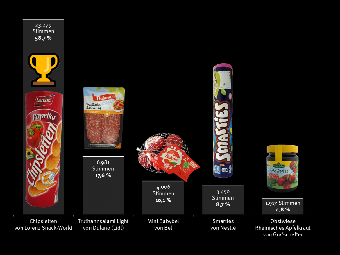 Neben den Chipsletten standen vier weitere Produkte als „Mogelpackung des Jahres 2018“ zur Wahl. 39.633 Verbraucher beteiligten sich an der fünften Online-Abstimmung zu Mogelpackungen.