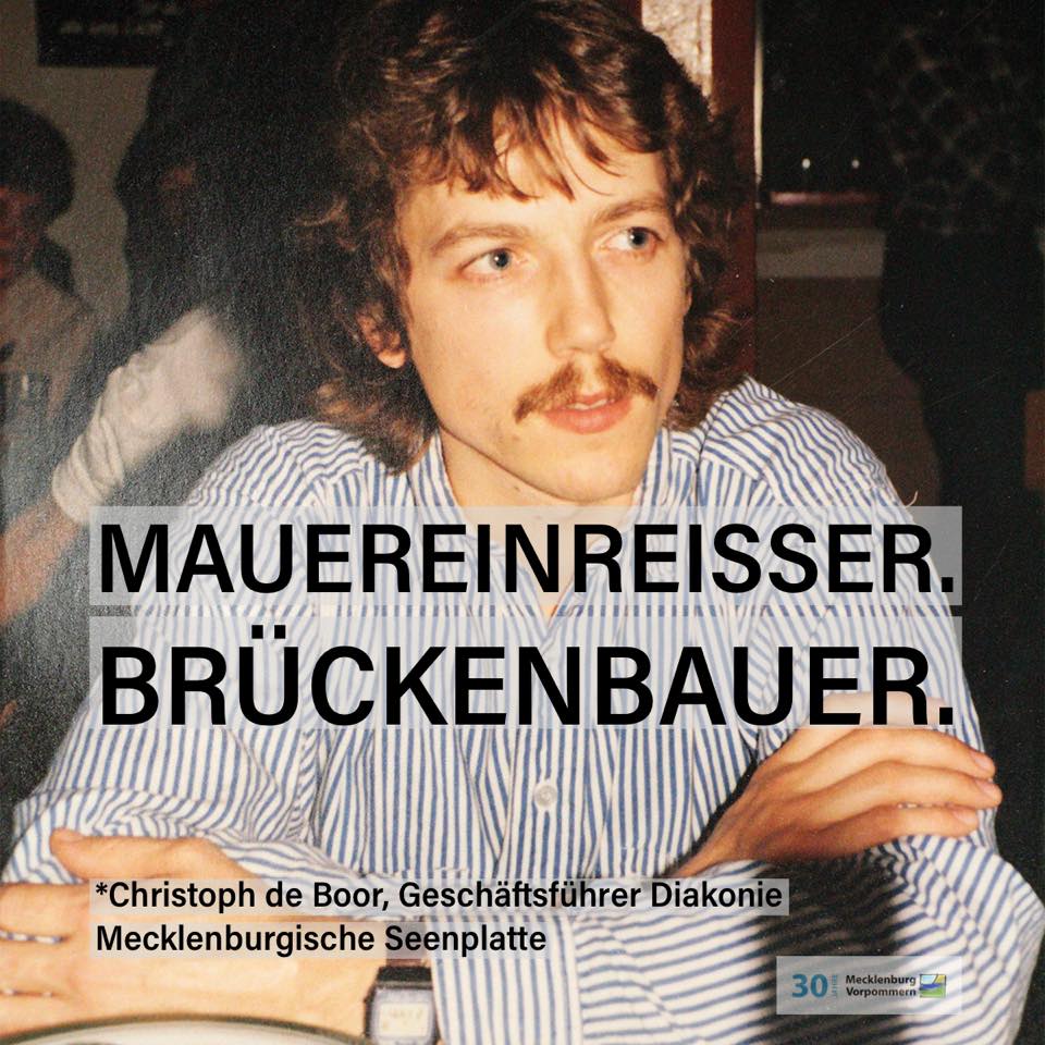 Christoph de Boor, Jahrgang 1961, habe die Friedliche Revolution in Waren von Anfang an begleitet, mitgestaltet und mit seinem Einsatz ein Stück ermöglicht. „Seine Wohnung war ein Ausgangspunkt der Friedlichen Revolution in Mecklenburg-Vorpommern. Das war mutig. Wer kam, musste damit rechnen, verhaftet zu werden. Aber das hat die Menschen nicht aufgehalten. Es kamen immer mehr. Die Wohnung war bald zu klein“, sagt die Regierungschefin. Es folgten Versammlungen in den Räumen der Gemeinde und schließlich die erste Demonstration in Waren: „Bei all diesen Momenten, die uns heute noch bewegen, war Herr de Boor dabei und als Warener Bürger und Vikar fast immer mittendrin.“
