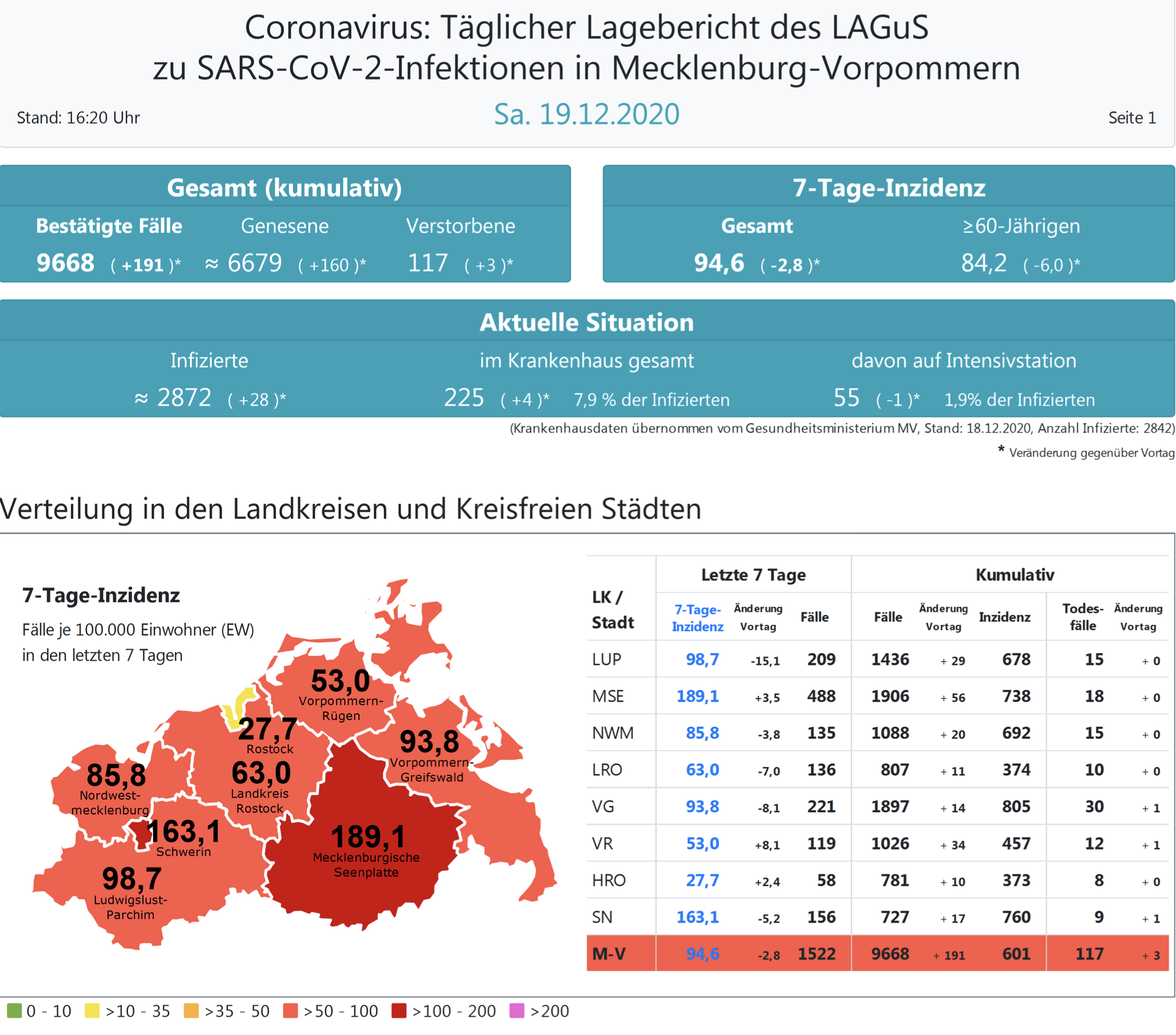 Insgesamt wurden in Mecklenburg-Vorpommern bisher 9668 Infektionen festgestellt. Im Land gab es bislang 117 Todesfälle, drei mehr als gestern.