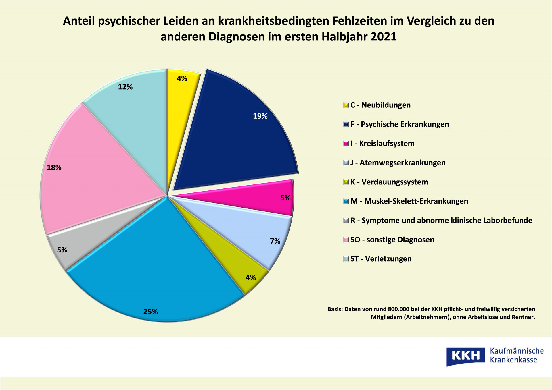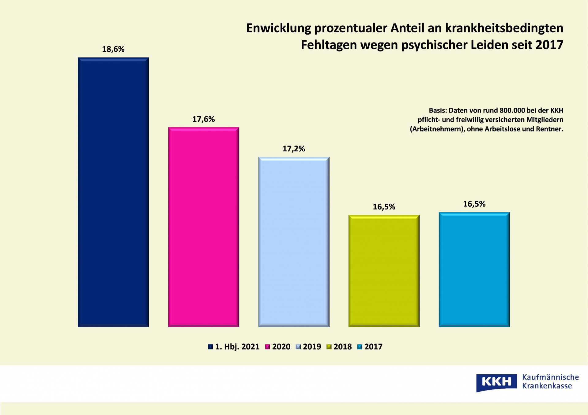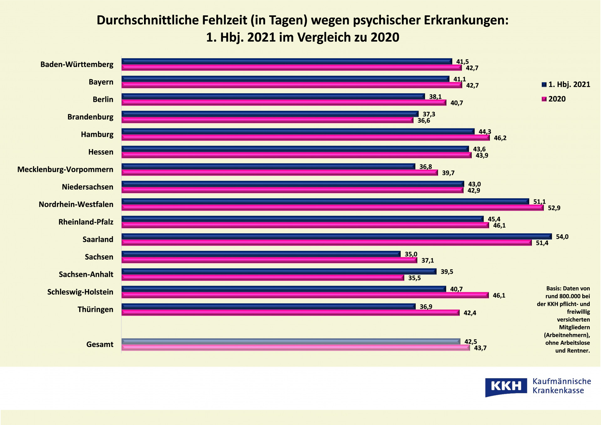 Im Bundesdurchschnitt fehlen Arbeitnehmer 2021 bislang 42,5 Tage aufgrund psychischer Diagnosen. Die längsten Fehlzeiten registriert die KKH mit 54 Tagen im Saarland, die kürzesten in Sachsen (35 Tage). Im Vergleich zu allen anderen Diagnosen liegen seelische Leiden auf Platz zwei hinter Rückenbeschwerden: Im ersten Halbjahr 2021 sind laut KKH-Daten bundesweit bisher rund 19 Prozent der krankheitsbedingten Fehlzeiten psychisch bedingt. Das ist der höchste Wert in den vergangenen Jahren. Im ersten Corona-Jahr 2020 lag die Quote bereits bei knapp 18 Prozent, in den Jahren vor der Pandemie schwankte der Anteil noch zwischen 16 und 17 Prozent.