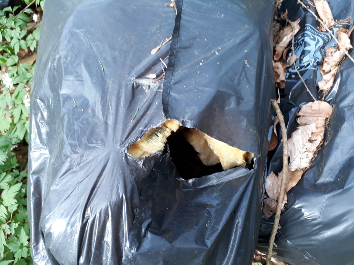 Makaberer geht’s nicht: In vier Säcken, die ein Umweltzeichen tragen, ist im Wald bei Rügeband Dämmwolle entsorgt worden.